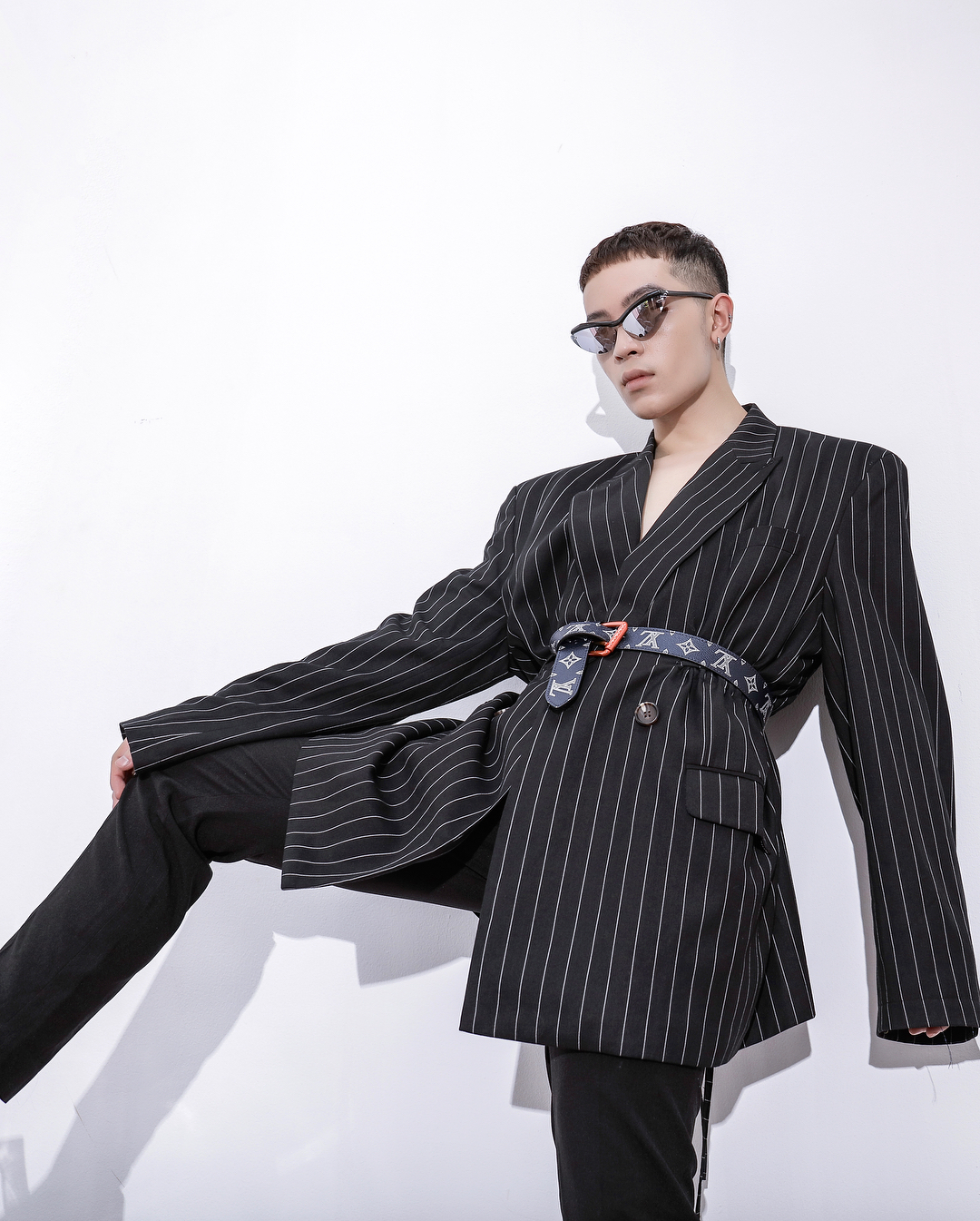 Kelbin Lei đã rất tinh tế khi lựa chọn sợi thắt lưng Louis Vuitton khác màu để tạo điểm nhấn vòng eo.