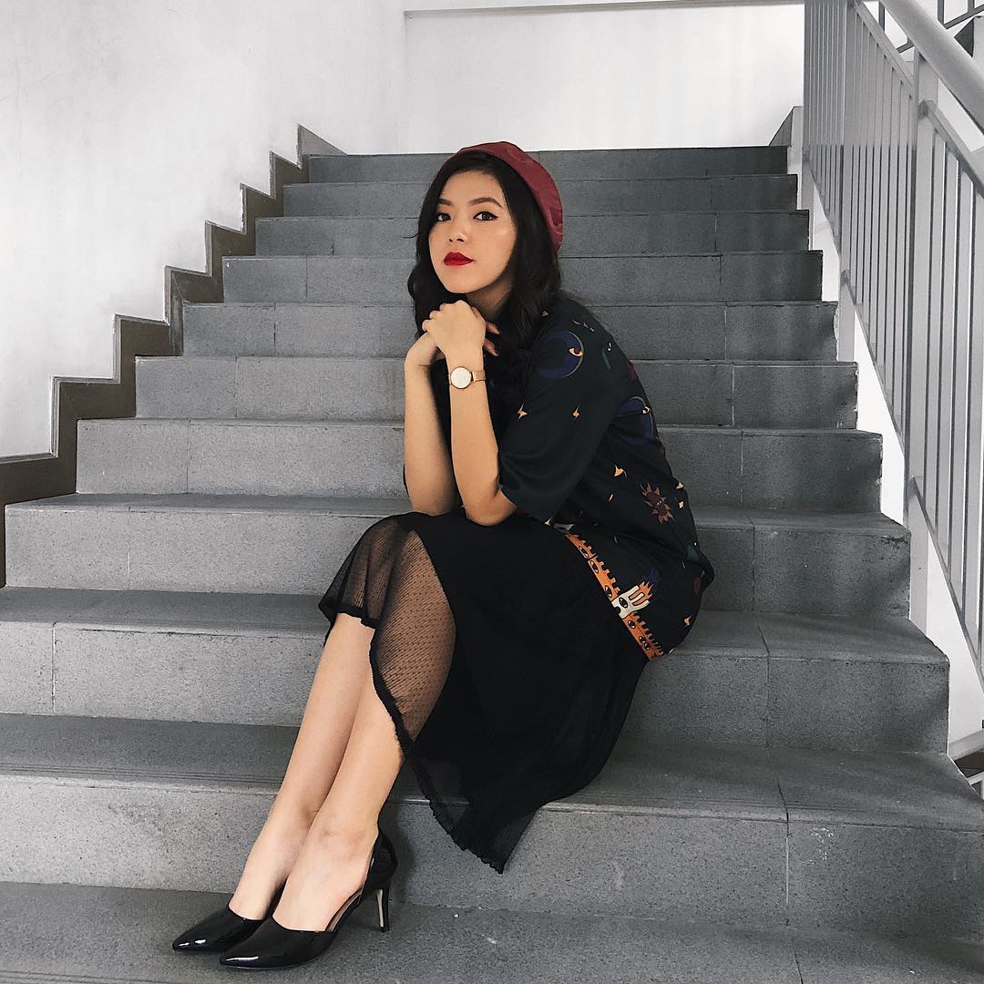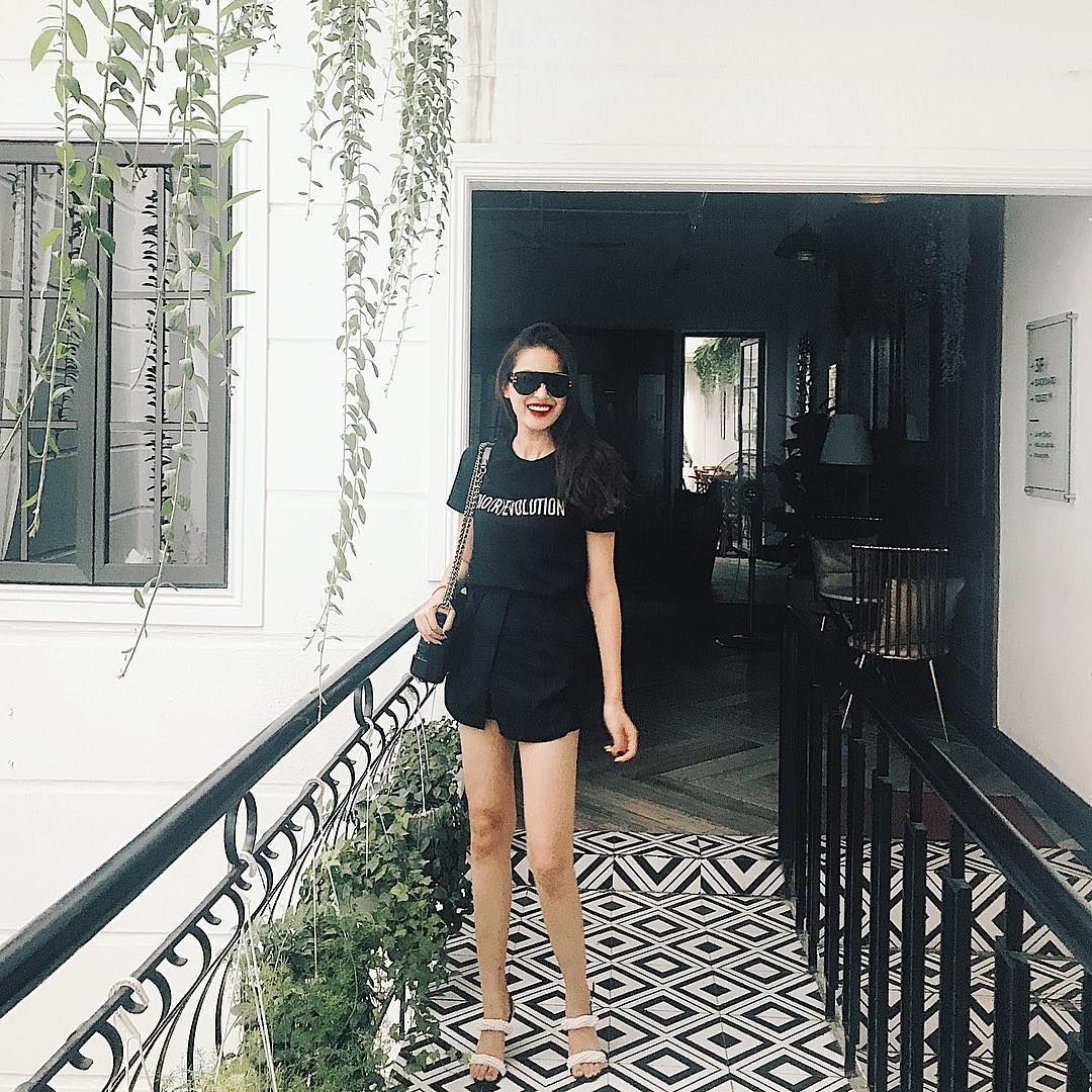 “Tiểu thư sang chảnh” của hội con nhà giàu, Hà Lade năng động cùng set đồ một tông màu. Trừ đôi giày cao gót, tất cả các item còn lại của cô đều tuyền một màu đen đơn sắc.