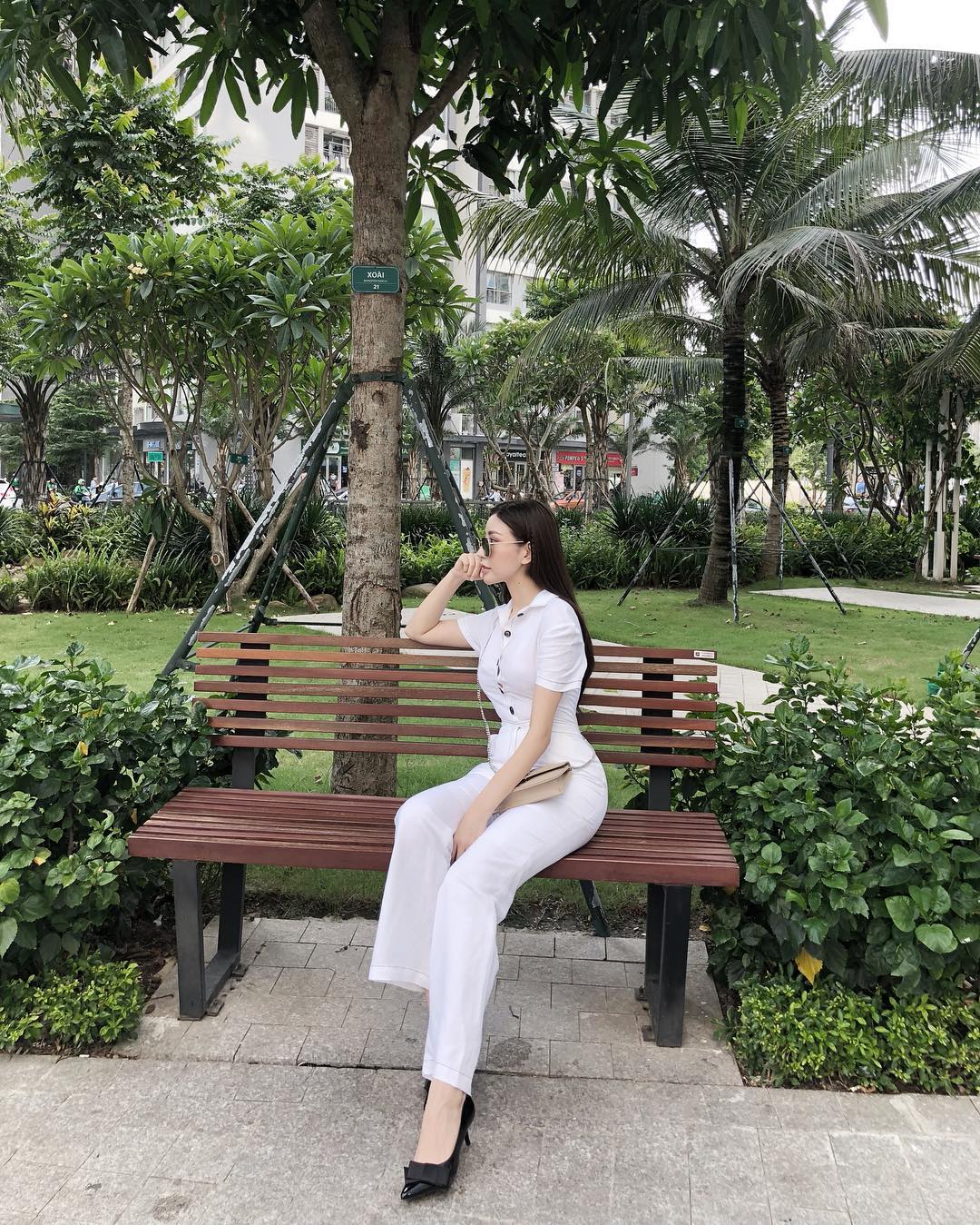 Nếu “em gái” Hà Lade lựa chọn tông đen thì “chị cả” “hội sang chảnh”-Lam Cúc lại ưa chuộng sắc trắng khi xuống phố. Người đẹp cũng khéo léo tạo dáng khoe được đường cong bản thân mà lại chẳng phô phang.