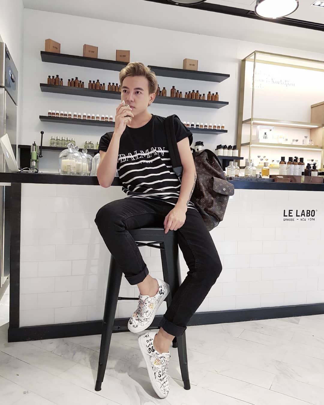 Chỉ lựa chọn những món cơ bản khi xuống phố, thế nhưng tất cả đều phải là hàng hiệu thì stylist Huy Mạch mới hài lòng: balo Louis Vuitton, áo thun Balman, giày Dolce & Gabbana, set đồ của anh đủ sức khiến các tín đồ thời trang phải thì thầm ghen tỵ.