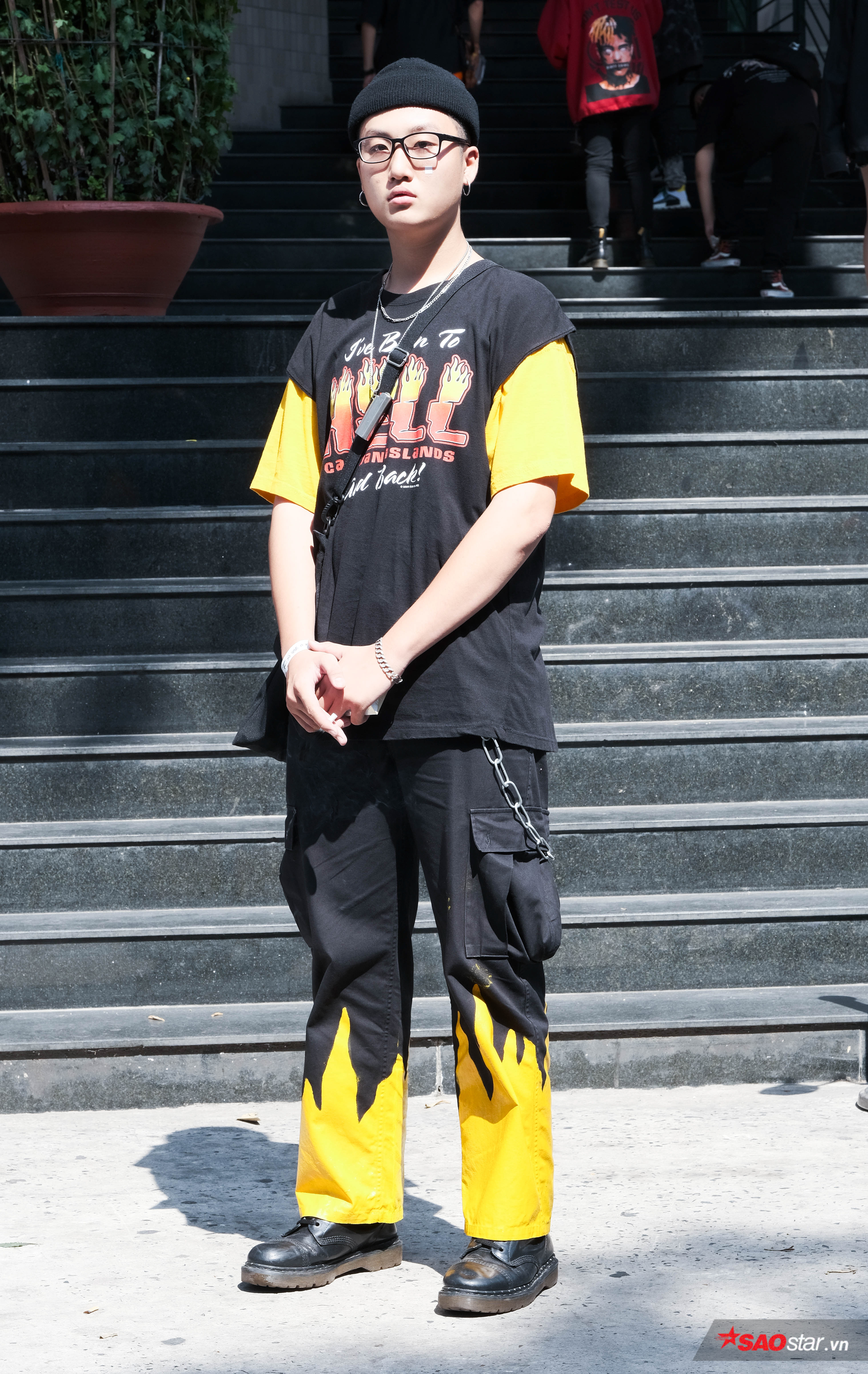 Anh chàng này trông thú vị vô cùng với áo phông tay màu vàng mix cùng quần họa tiết ánh lửa.