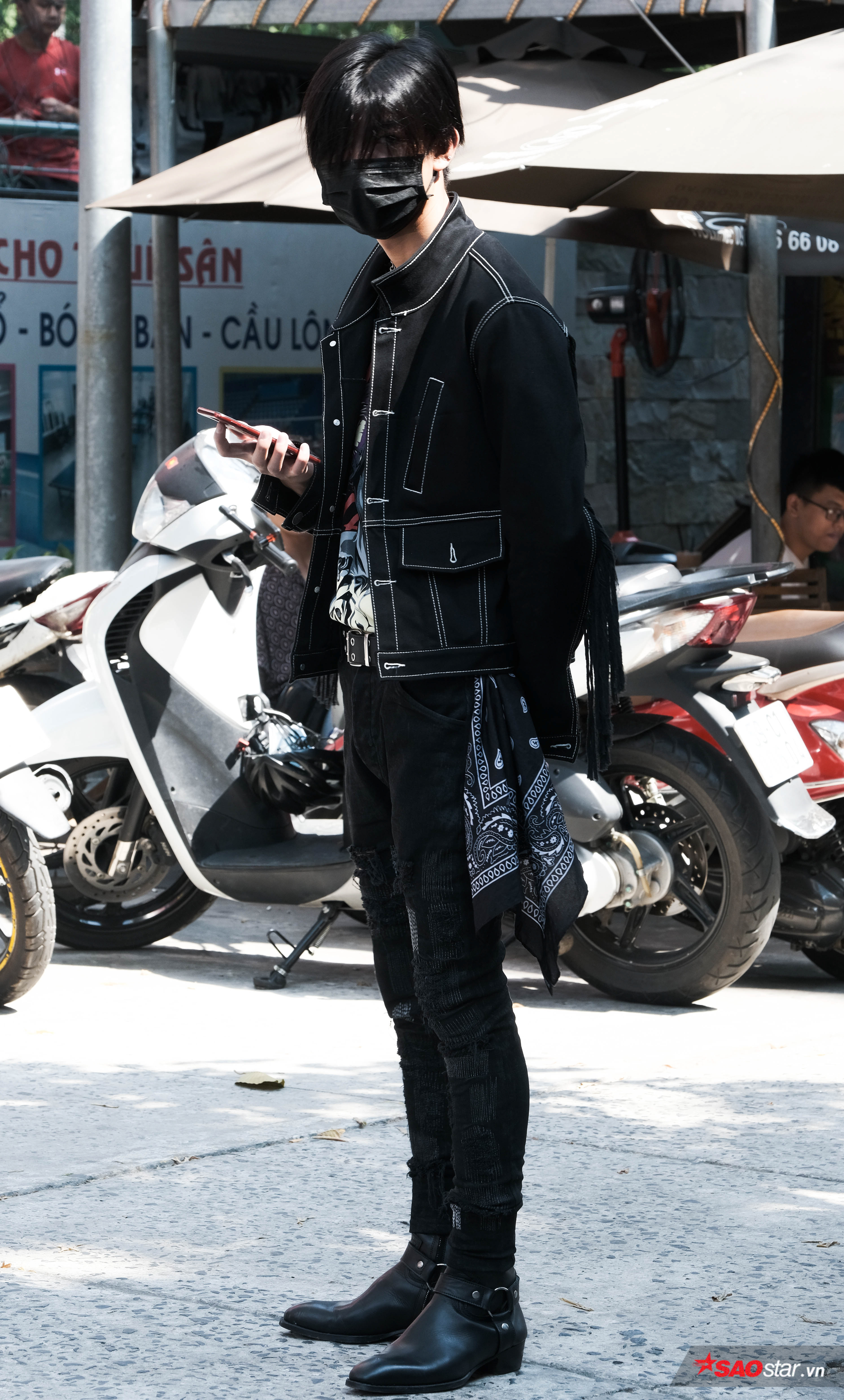 Đừng ai bảo allblack là nhàm chán, vẫn là đen đấy nhưng hãy xem cách cậu ta phối từng phụ kiện cho tới chi tiết đường chỉ trắng may dằn… Một chút gì đó chơi bời lả lướt nhưng kèm với nó là nét thô cứng trong phom áo, tạo nên sự đối lập hoài hòa.