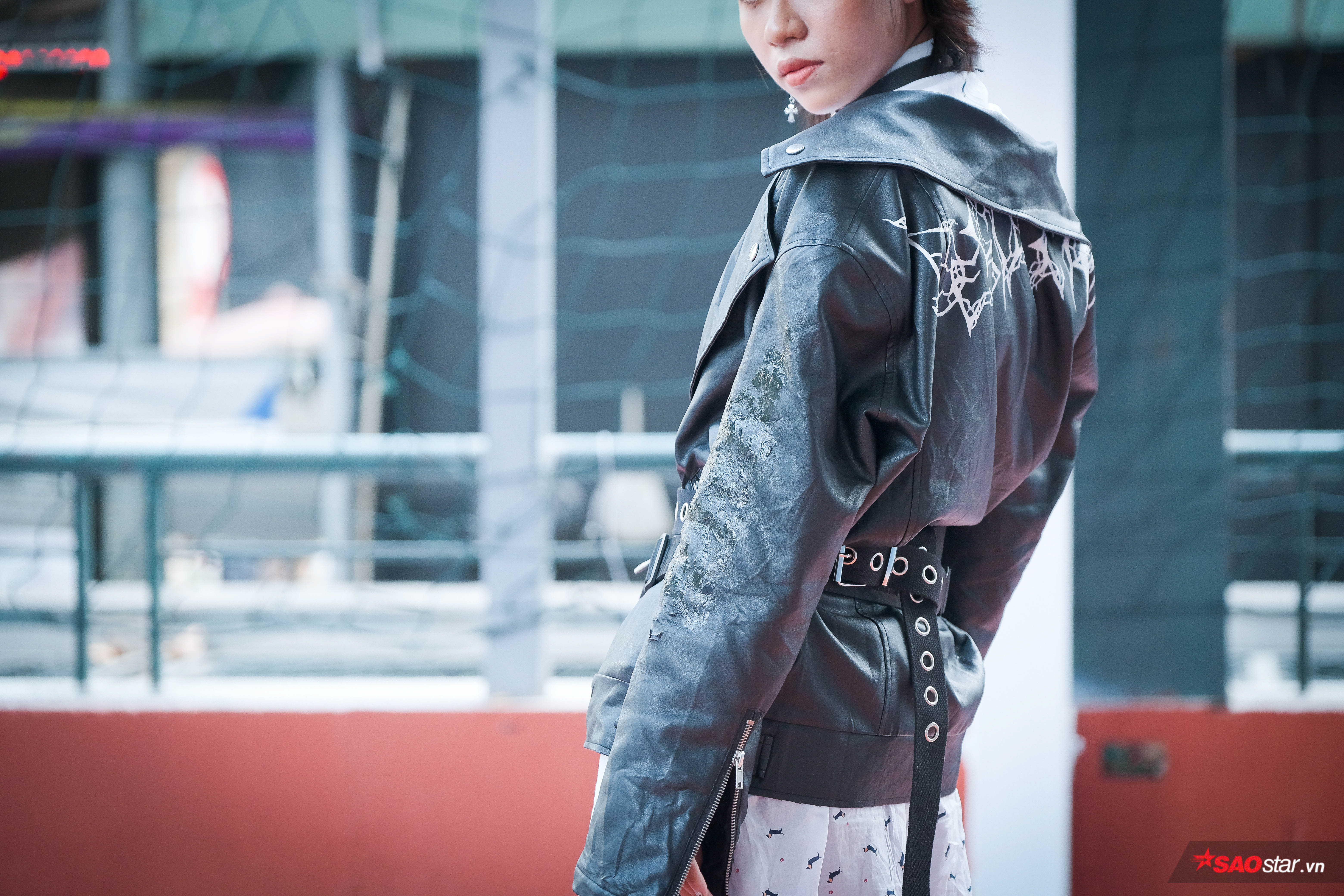 Ngoài ra, sự phối hợp giữa chiếc áo da mạnh mẽ, cá tính cùng chân váy voan mềm mại, bay bổng cũng là một điểm cộng. Tưởng chừng không hợp nhưng hóa ra lại hợp không tưởng.