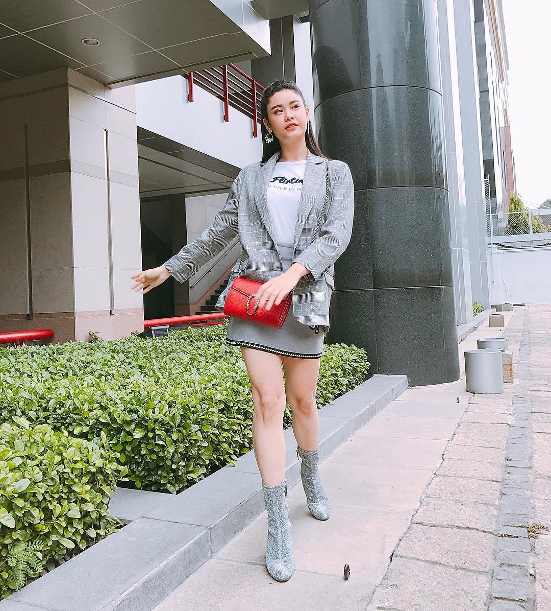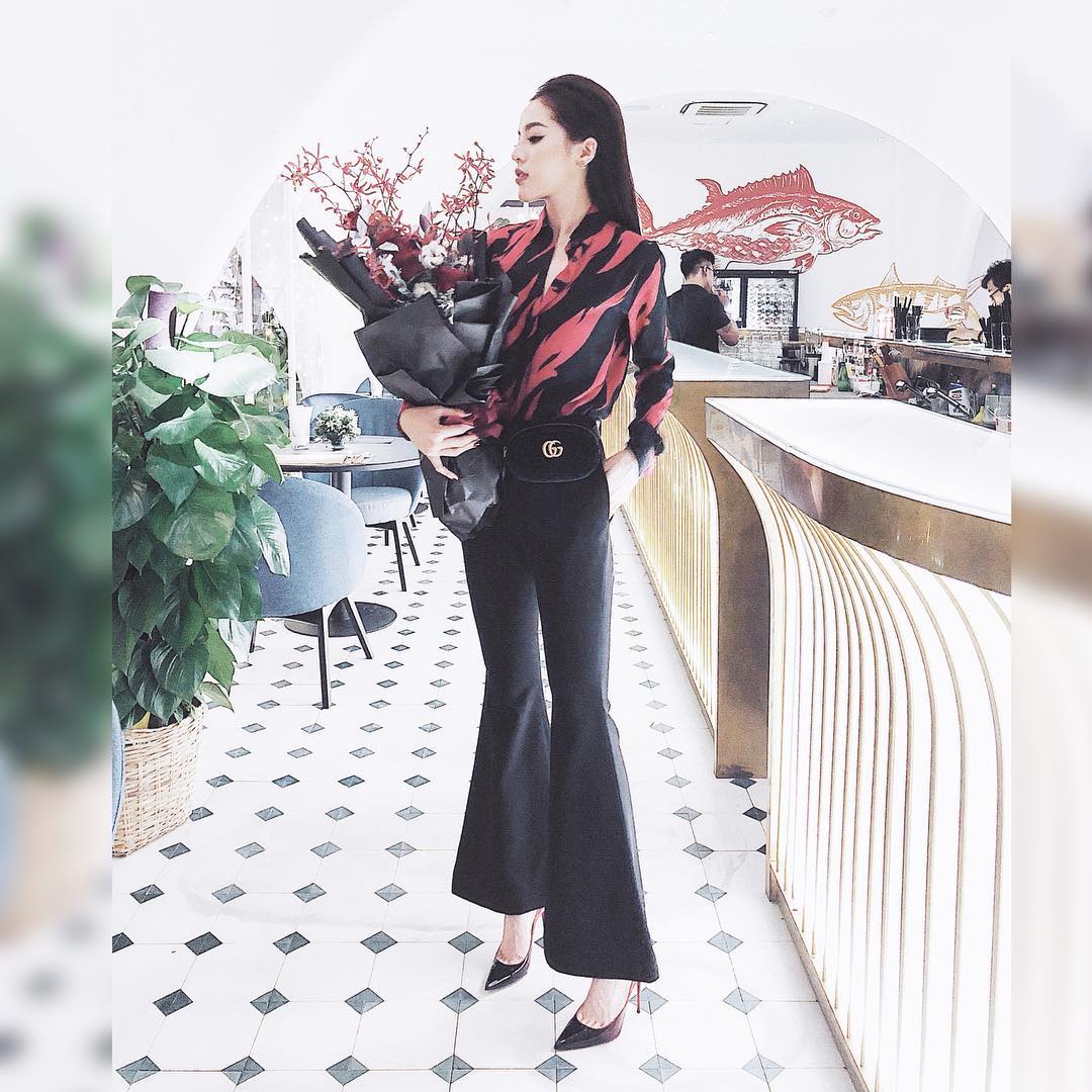 Kỳ Duyên lại tiếp tục chứng minh gout ăn vận thời thượng với quần ống loe, áo sơ - mi đỏ đen cùng túi Gucci đeo hông đắt giá.