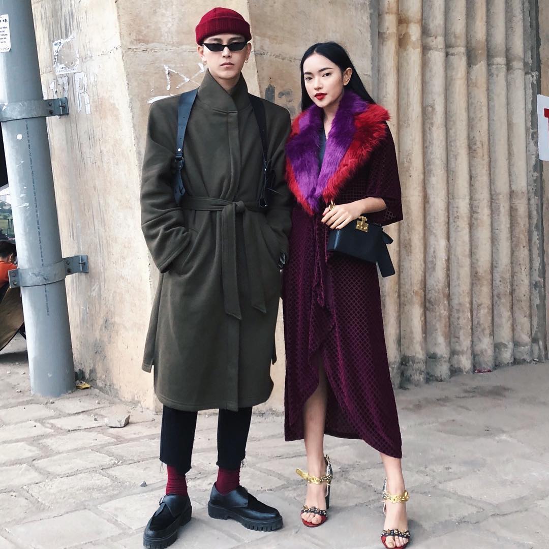Cặp đôi fashionista Châu Bùi, Decao lựa chọn áo khoác dáng dài khi xuống phố những ngày đầu năm. Nếu Châu Bùi cá tính với áo khoác có điểm nhấn ở phần cổ lông màu sắc thì Decao lại có phần mạnh mẽ với cả cây áo tông màu xanh rêu đi cùng kính mắt mèo và nón len.