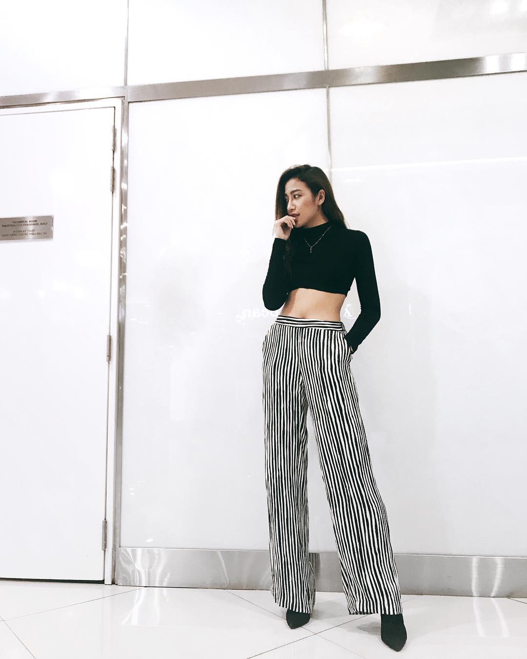 Phan Ngân The Face khoe vòng eo thon gọn cùng đôi chân dài thẳng tắp với set đồ gồm áo crootop đen và quần suông họa tiết sọc ngựa vằn.