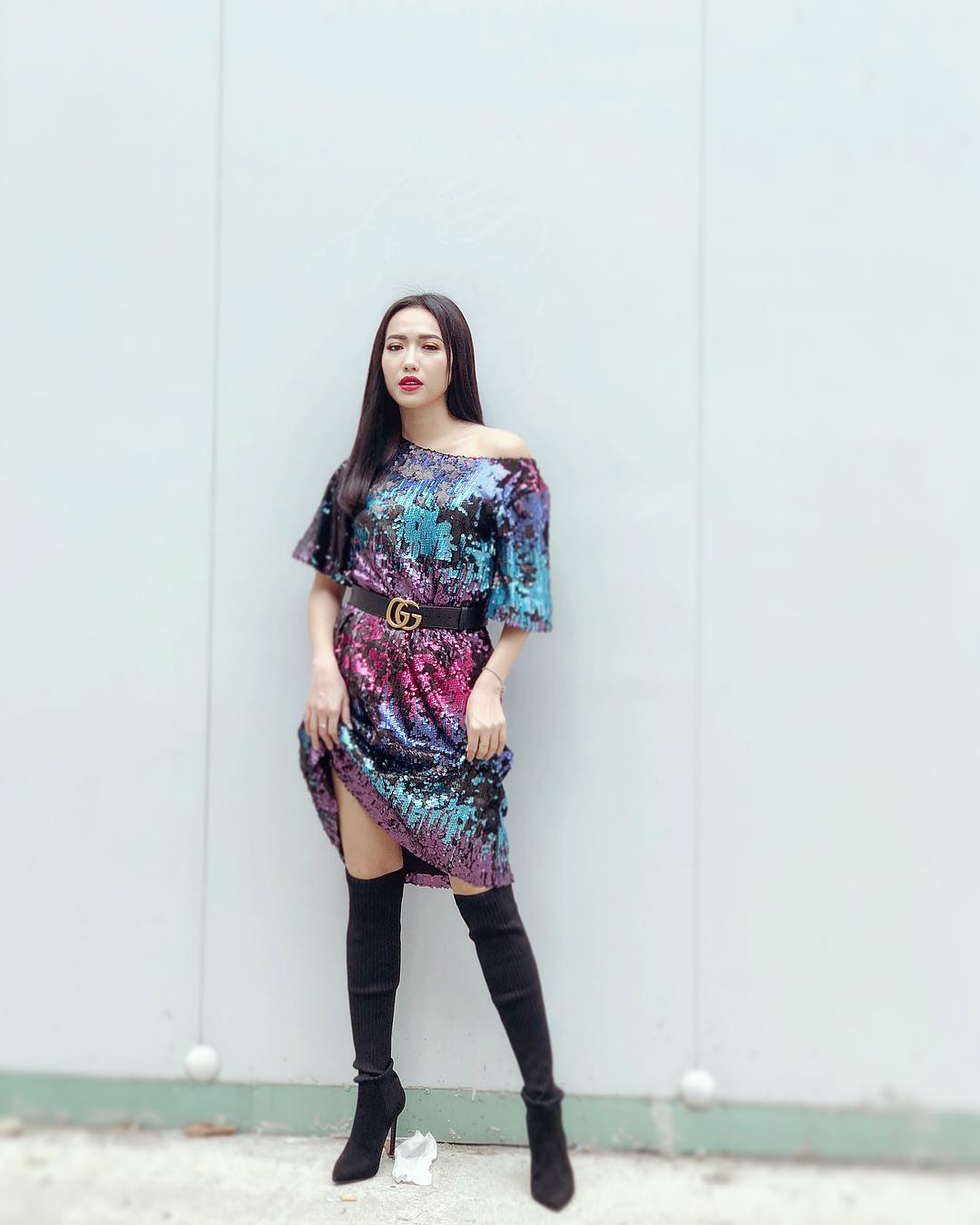 “Hoa hậu làng hài” Diệu Nhi khiến người hâm mộ bất ngờ với phong cách quyến rũ, thời thượng. Cô nàng lựa chọn váy sequin màu sắc cùng boots cổ cao, mái tóc rẽ ngôi giữa, chải thẳng cũng được cho là hoàn toàn phù hợp.