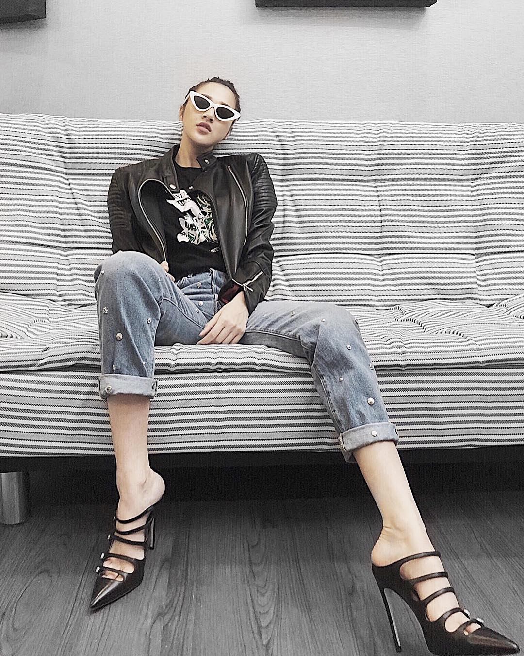 Bảo Anh gây bất ngờ với vẻ ngoài lạ lẫm. Không còn theo đuổi phong cách quyến rũ, nữ tính quen thuộc, giọng ca “Sống xa anh chẳng dễ dàng” lựa chọn áo khoác da, jeans nạm đính cùng kính mắt mèo để có được bề ngoài cá tính.