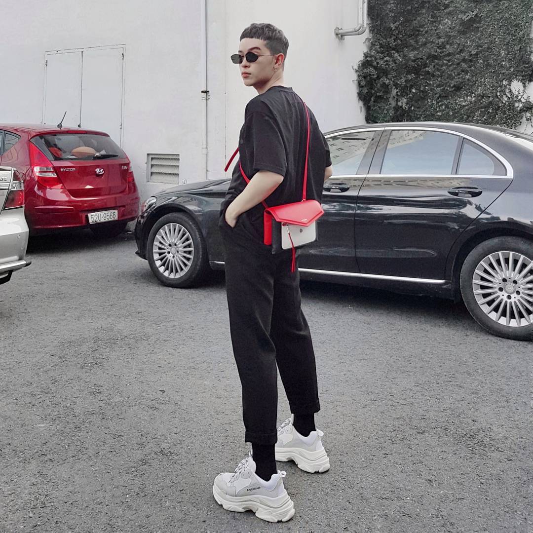 Áo và quần gam màu đen basic nhưng Kelbin vẫn khéo léo lựa chọn giày Balenciaga trắng cùng chiếc túi đeo chéo màu sắc nhằm tạo điểm nhấn trong set đồ.