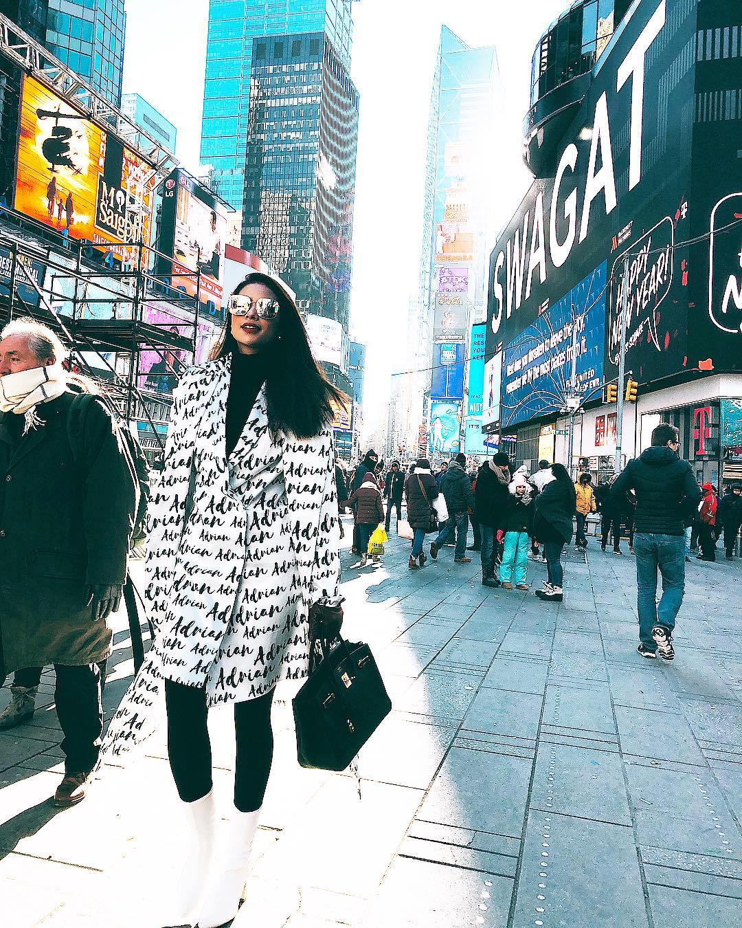 Phạm Hương tự thưởng cho mình một chuyến du lịch nước ngoài vào năm mới. Người đẹp lựa chọn áo khoác dáng dài in họa tiết typo đi cùng boots cổ cao cùng tông màu trắng. Cô cũng không quên phối cùng túi Hermes đắt tiền và kính mát nhằm tăng vẻ thời thượng.