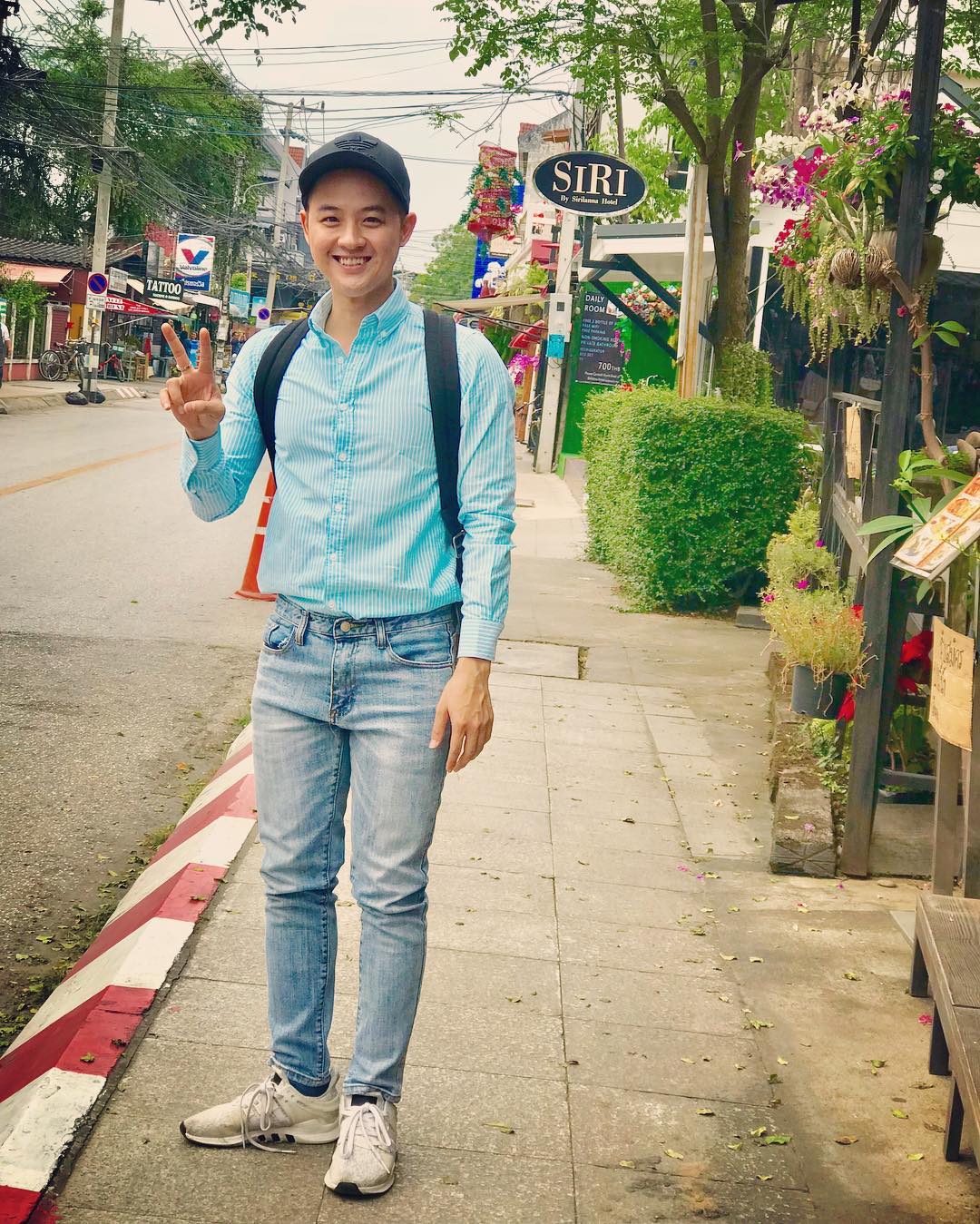 Set đồ basic, đơn giản gồm áo sơ - mi và quần jeans, mũ phớt là lựa chọn của ca sĩ Thanh Duy trong những ngày đầu năm.