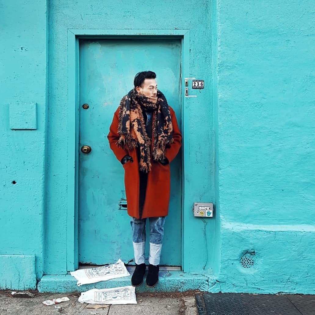 NTK Trương Thanh Long lại ưa chuộng tông màu đỏ rực rỡ vào những ngày đầu năm. Anh cũng sử dụng chiếc khăn màu sắc cùng quần jeans wax nhằm giúp tổng thể bớt “làm quá”.