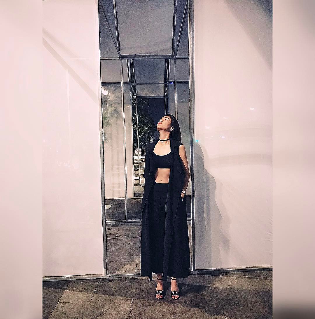 Sử dụng tông đen cho trang phục để tăng nét bí ẩn, Mỹ Duyên vẫn không quên phô diễn vòng eo thon với croptop.