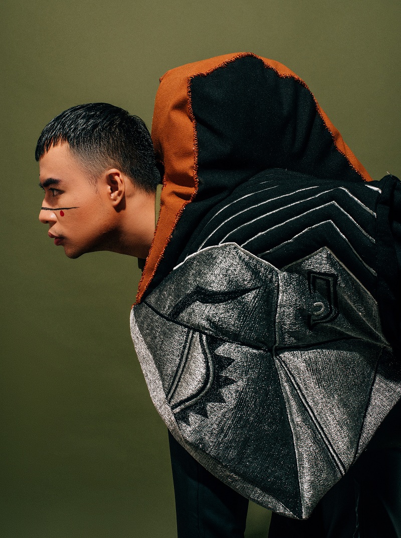 Concept đồ thứ nhất của Hữu Anh tạo nên sự lạ mắt khi đưa hình ảnh các khối hình học xếp chồng chéo lên nhau với ba tông màu cơ bản xám, nâu, xanh rêu với kỹ thuật tạo khối cầu kỳ, khiến người xem liên tưởng tới những khối núi đá chồng chất của bộ lạc cổ xưa, khơi nguồn cảm hứng sáng tạo mới.