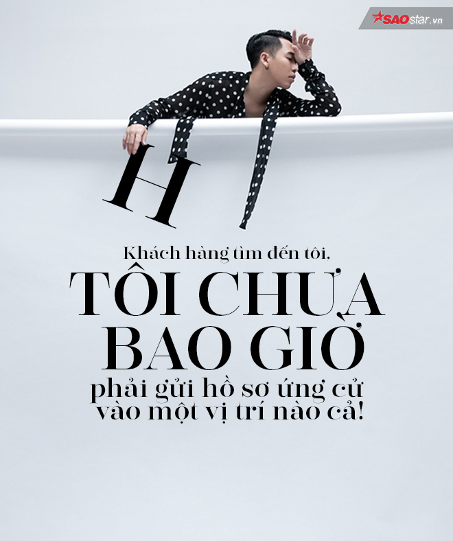 - Tôi may mắn vì từ trước đến nay các công việc stylist đến các project khác đều là khách hàng tìm tới và ngỏ lời hợp tác. Tôi chưa bao giờ phải gửi hồ sơ để ứng cử vào bất kỳ vị trí nào. Và may mắn là tôi có thể nói lời từ chối.