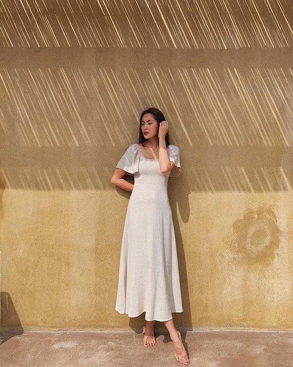 Trước có thời gian đi biển, Hà Tăng cũng rất chuộng các dáng váy trắng suông dạng maxi để tung tăng và đem lại sự thoải mái khi mặc
