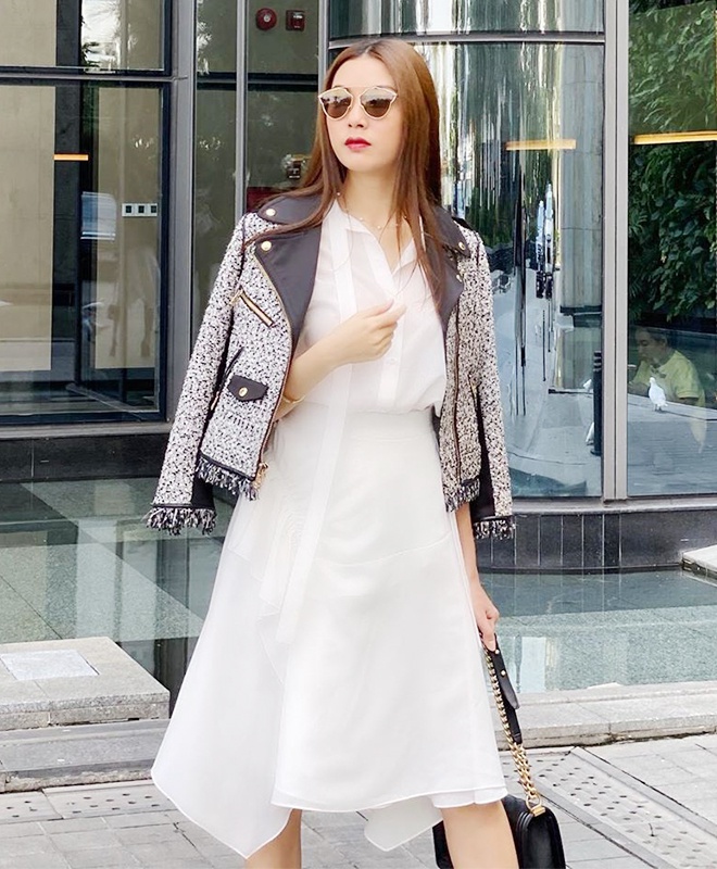Ngày hạ nhẹ nhàng diện một thiết kế váy trắng mix cùng áo khoác không cần quá cầu kì cũng khiến Thúy Vân nổi bật trên phố