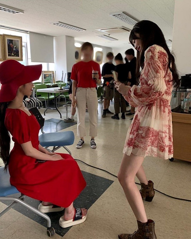 Trong hình sau hậu trường khi đang đứng chụp hình cho IU, Sulli khoác trên mình kiểu váy đậm chất mùa hè đến từ Chloé có giá 3.295 USD ( tầm 76 triệu đồng).