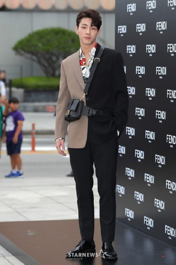 Tại sự kiện thời trang cũng có nam diễn viên Kim Ji Soo trong bộ suit đối xứng màu nâu - đen cá tính cùng kiểu túi đeo chéo unisex