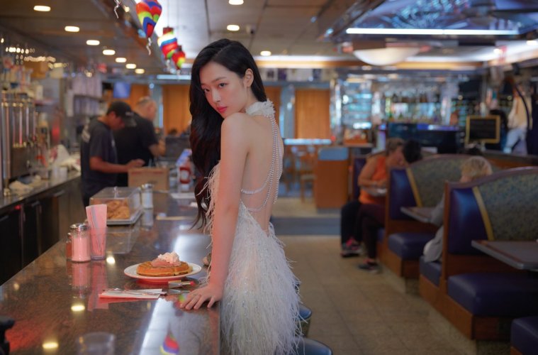 Sulli diện đầm sang trọng, khoe làn da trắng nõn nà nằm sõng xoài trên bàn ăn