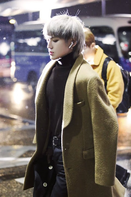 Nhìn xem, TaeYong có giống một vị hoàng tử lạnh lùng đầy khí chất với áo khoác dáng dài màu vàng đất kết hợp cùng áo thun cổ lọ màu đen bên trong không?