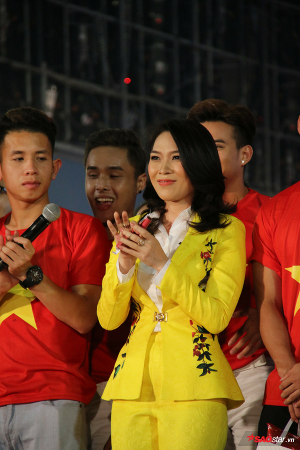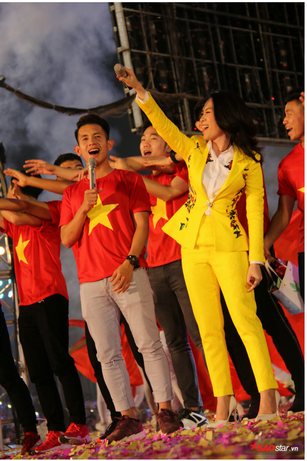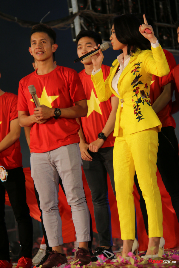 Mỹ Tâm chọn cho mình bộ vest vàng rực vốn đã rất nổi bật lại càng nổi bật hơn khi đứng cùng sân khấu cùng các thủ đội tuyển U23 Việt Nam với màu áo đỏ rực rỡ .