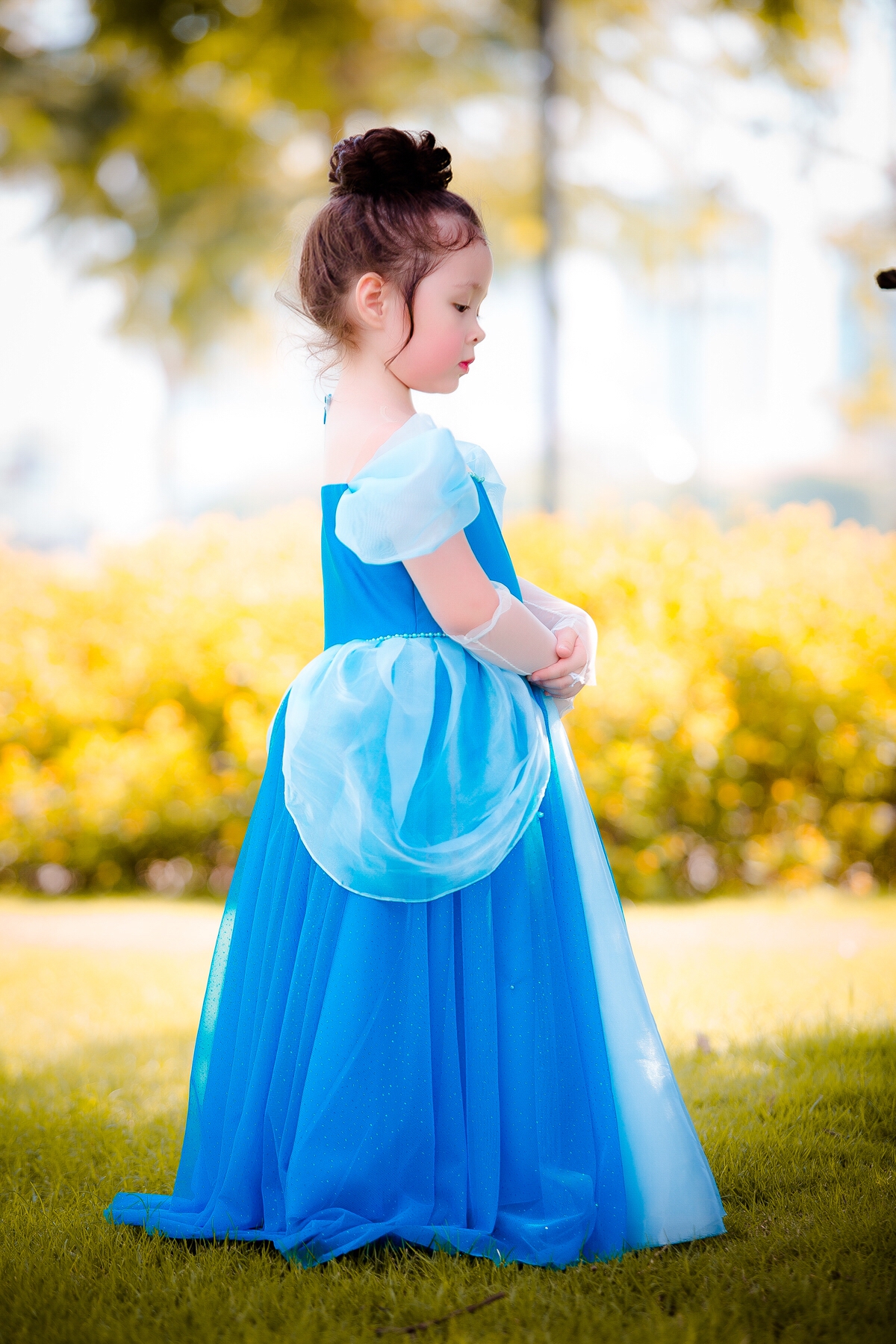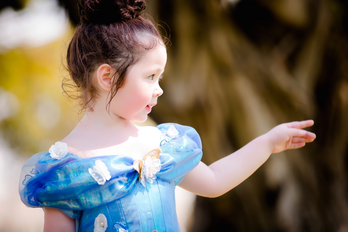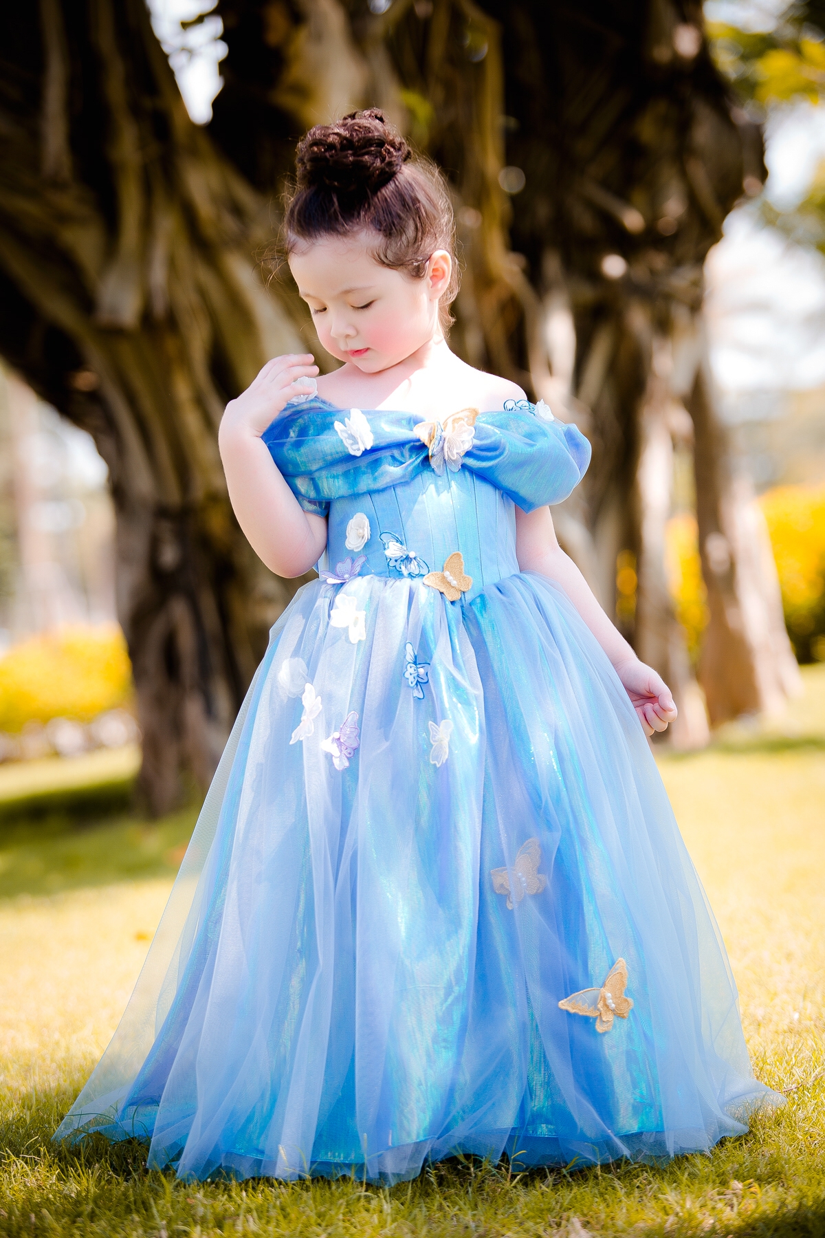 Hóa thân thành nàng Lọ Lem phiên bản điện ảnh, diện chiếc váy màu xanh kinh điển đính kết bướm sau khi được mẹ Tiên ban phép màu. Cô bé Cadie Mộc Trà thật xinh xắn và đáng yêu quá đỗi.
