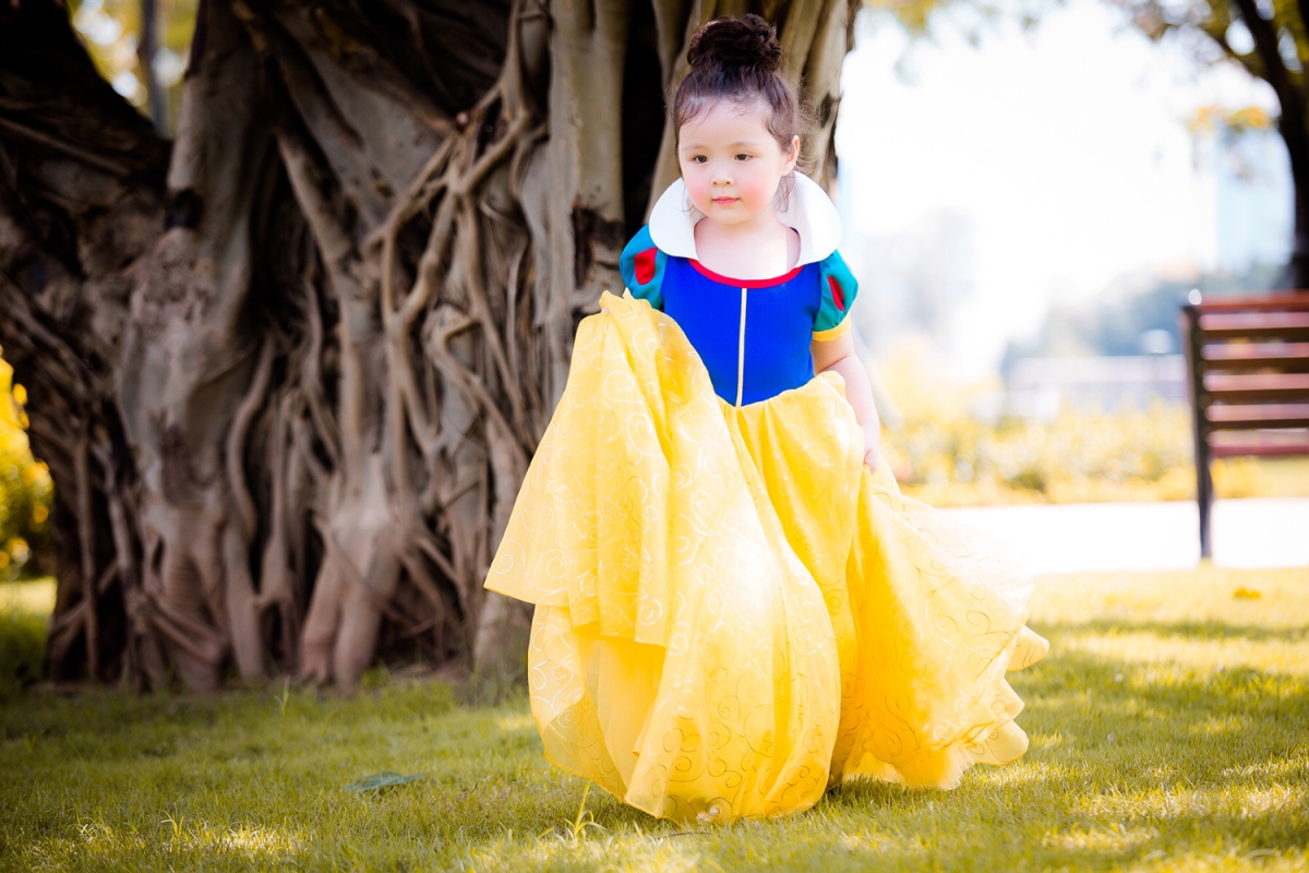 Nổi bật nhất là phần hóa thân thành Bạch Tuyết. Trong bộ trang phục kinh điển của nhân vật, với phần tay phồng, cổ đứng phối những màu sắc nổi bật. Cadie Mộc Trà trở thành nàng Bạch Tuyết hồn nhiên, vô tư đang lạc trong rừng.