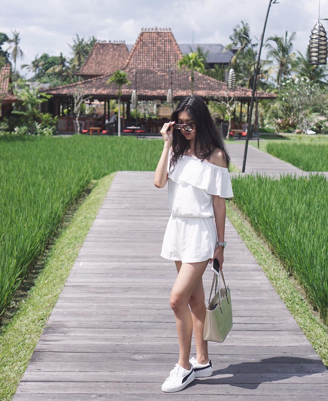 Đến tươi tắn, trẻ trung cùng áo trễ vai trắng phối với quần shorts theo style “giấu quần”.