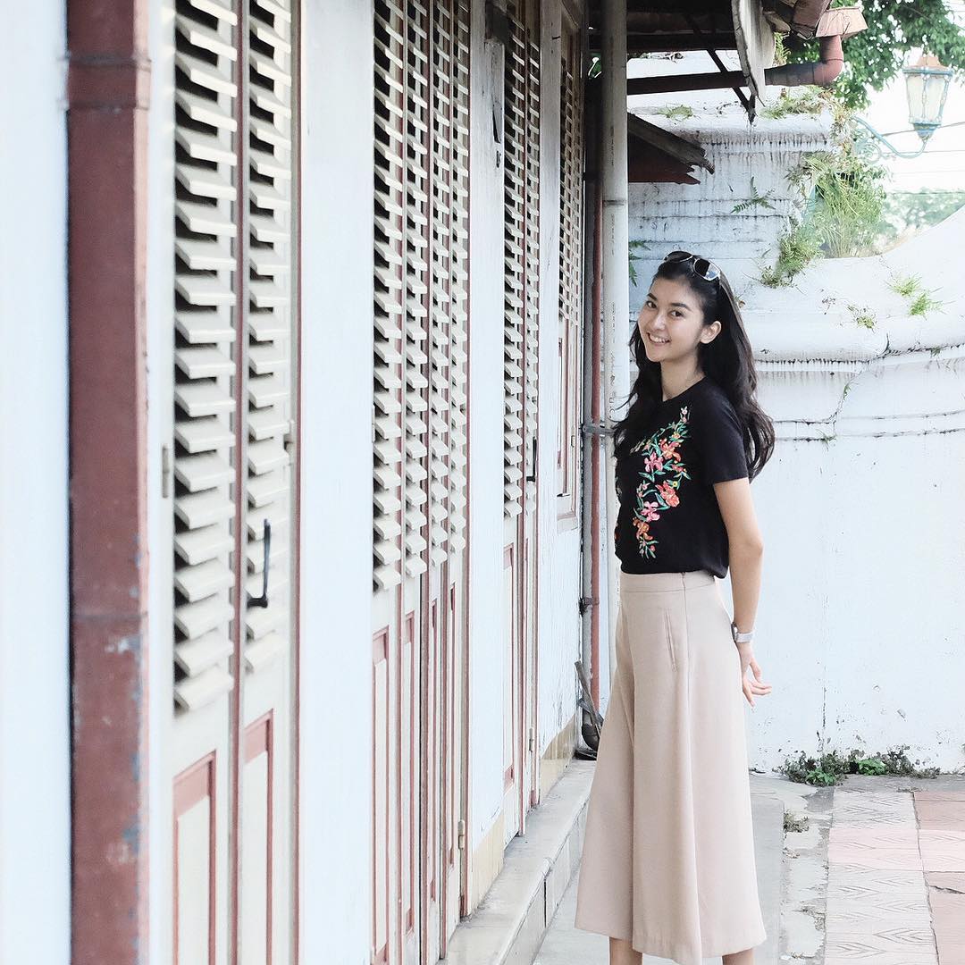 Quần culottes cùng áo phông thêu họa tiết, vừa trẻ trung, năng động mà rất hợp với lứa tuổi 21 của tân hoa hậu.
