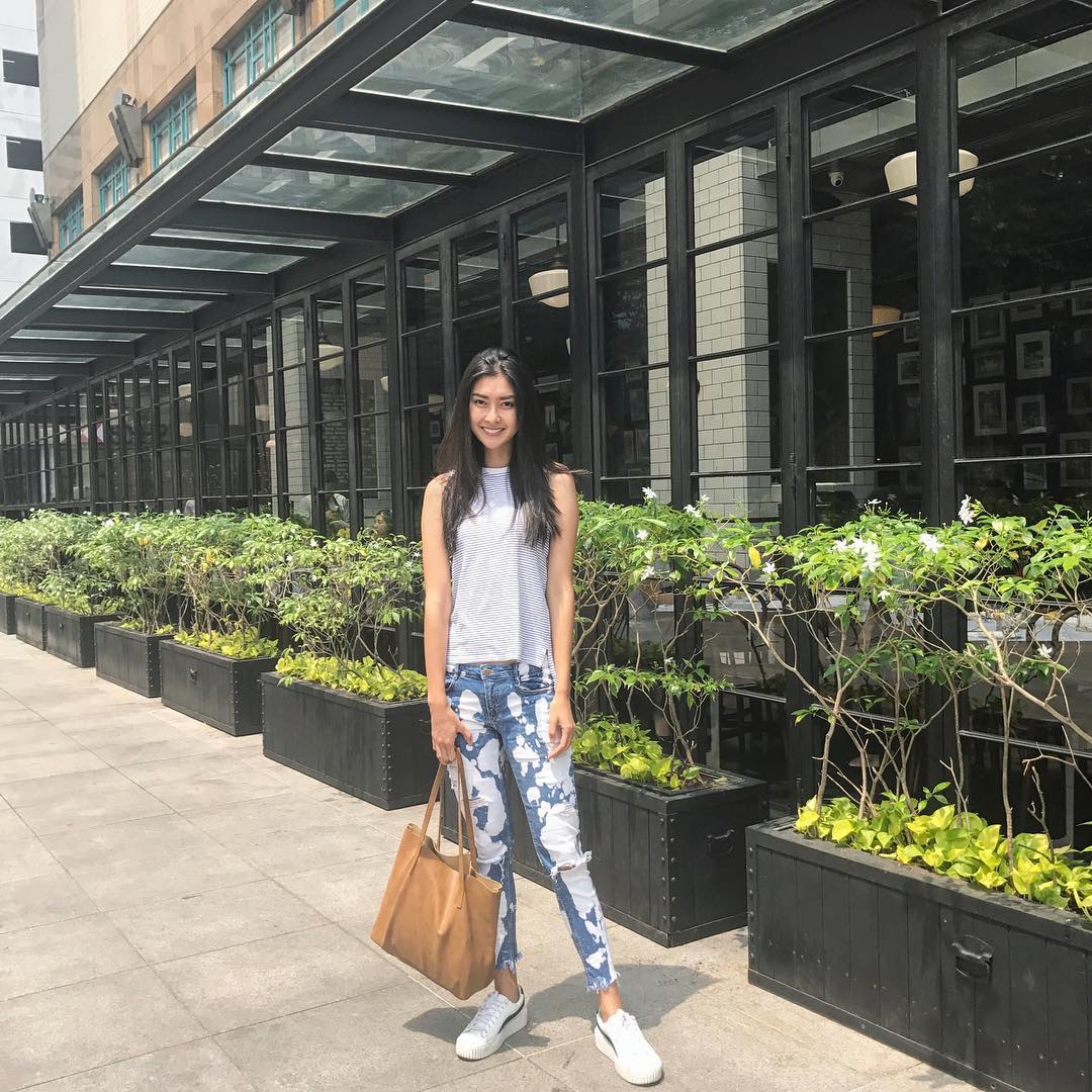 Đôi khi, cô chọn cho mình bộ cánh mang đến cảm giác thoải mái, dễ chịu trong các hoạt động bên lề cuộc thi Hoa hậu Quốc tế 2017. Bộ cánh đồng thời phát huy được lợi thế vóc dáng của người đẹp cao 1,77 m.
