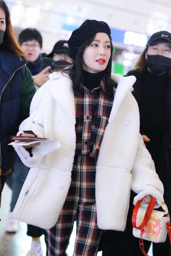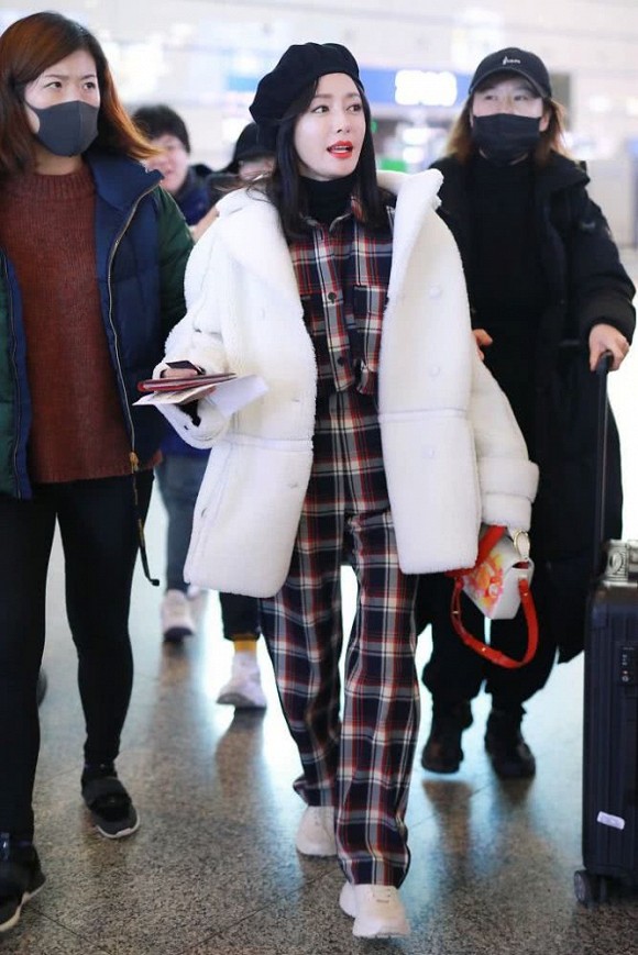 Tần Lam trong set đồ sọc caro mix cùng áo khoác lông màu trắng bên ngoài và giày thể thao khi xuất hiện tại sân bay Thượng Hải.