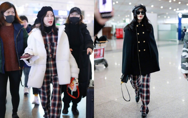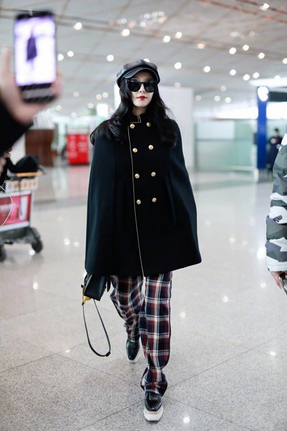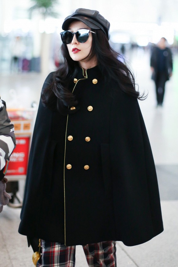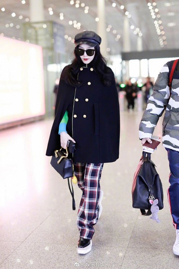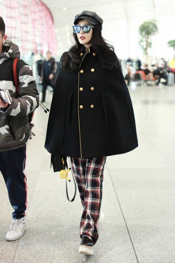 Trước đó không lâu, Phạm Băng Băng xuất hiện tại sân bay Bắc Kinh trong style đồ kín đáo, ấm cúng với áo khoác cánh dơi đen mix cùng chiếc quần có phần hơi lạc quẻ