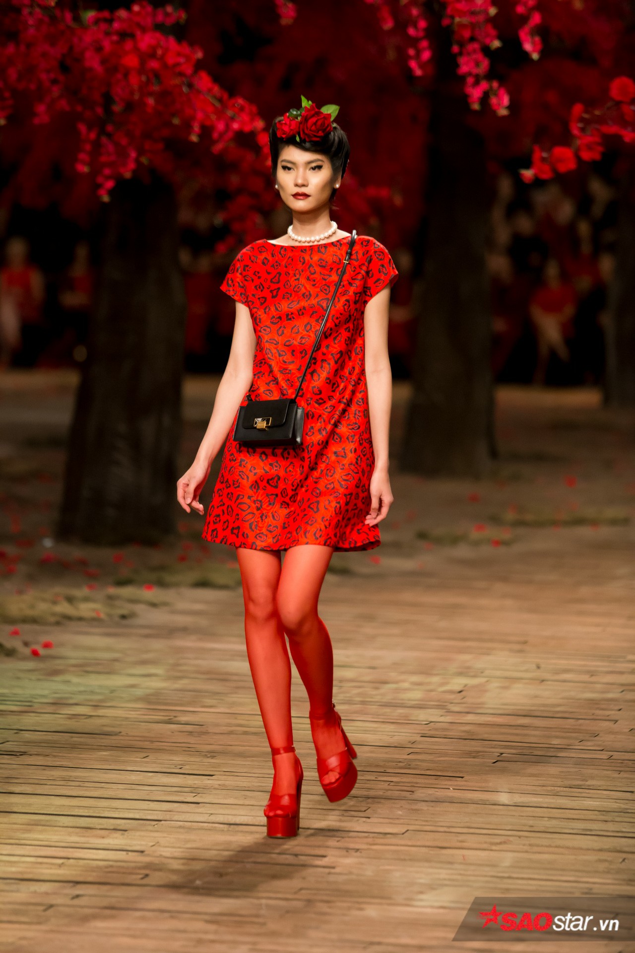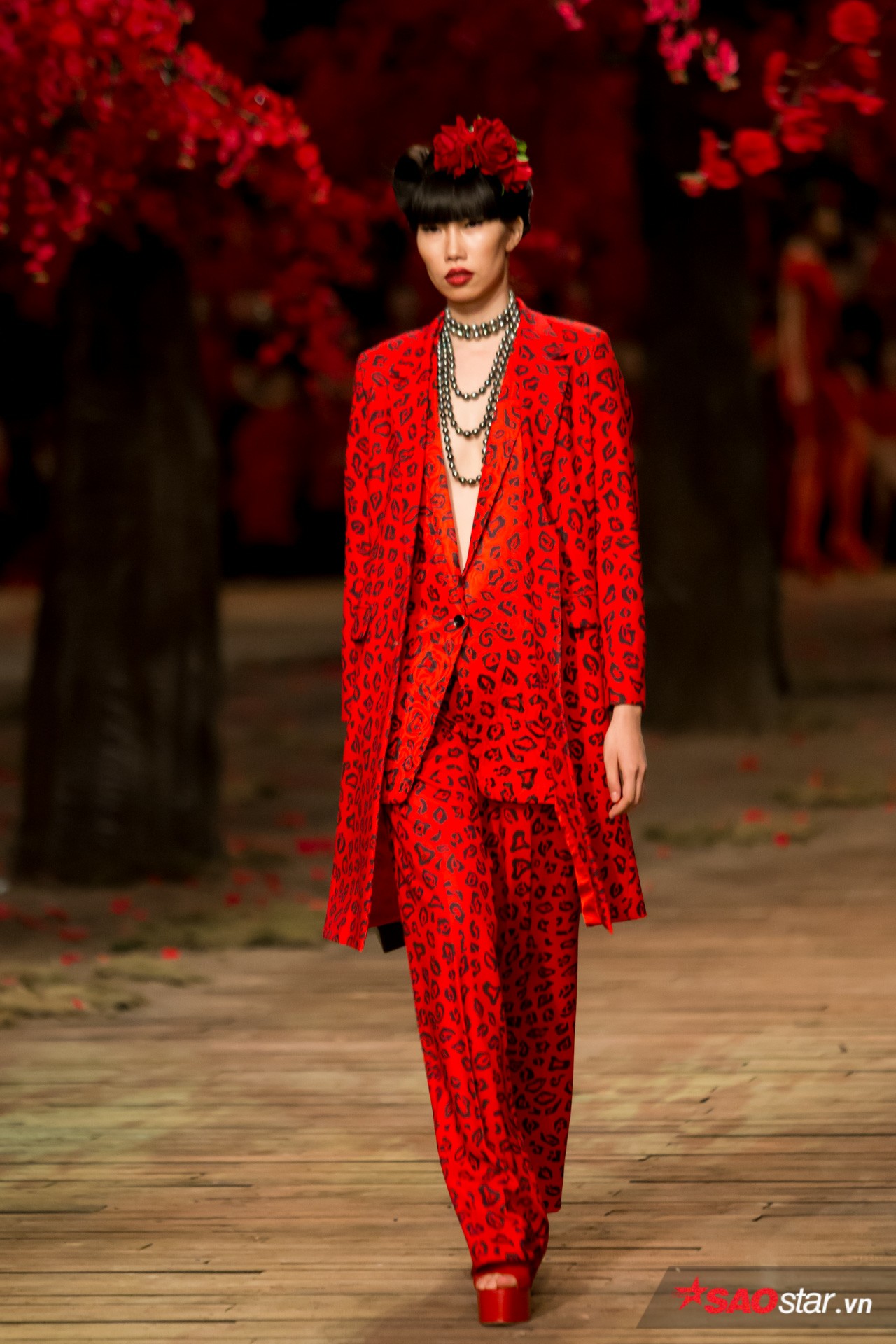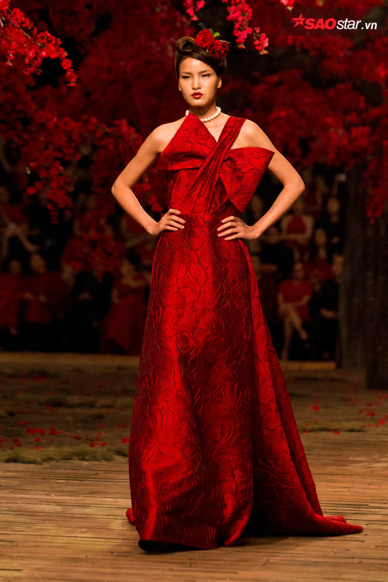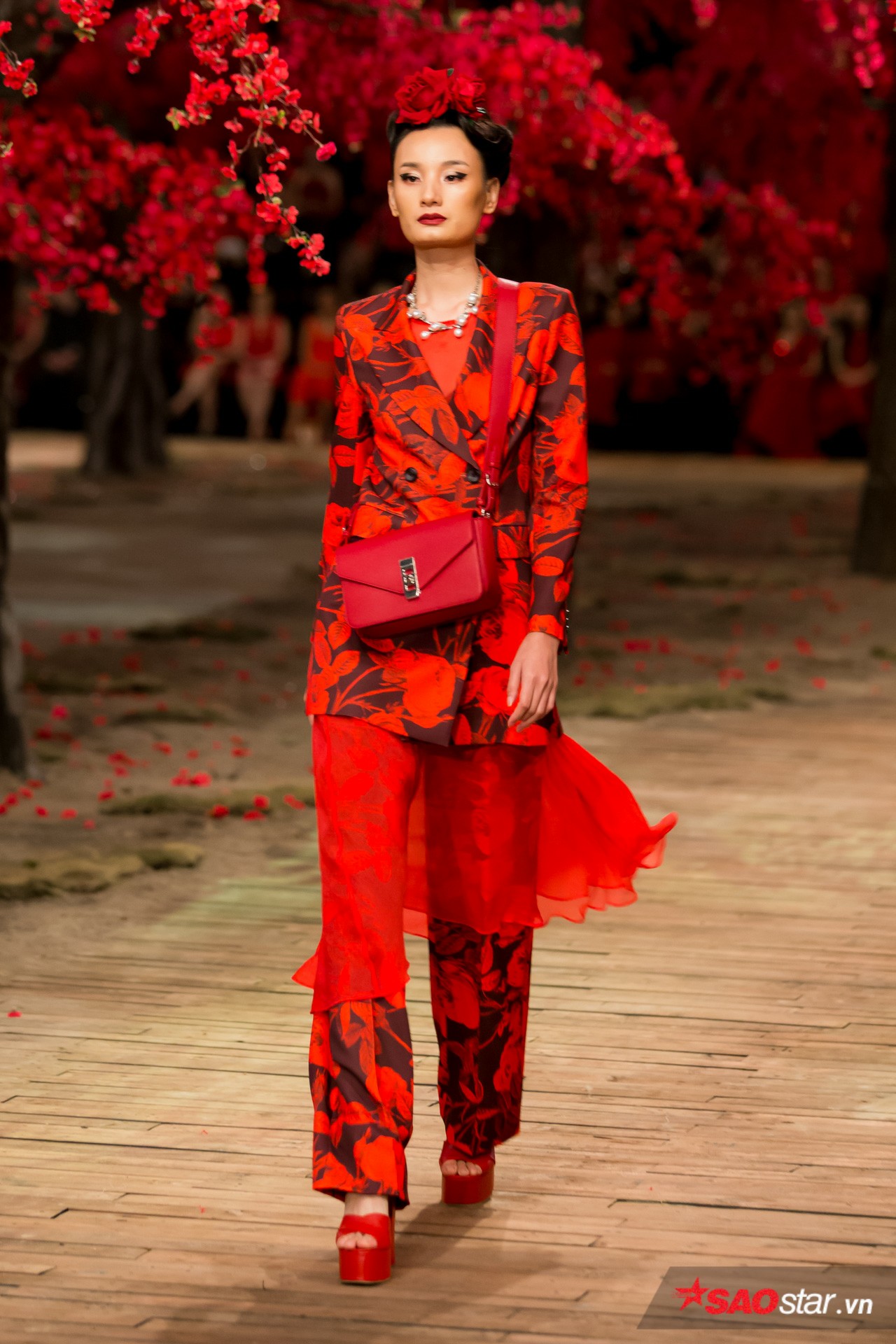 Sử dụng độc nhất gam màu đỏ, nhưng cách lựa chọn tông màu, chất liệu “cao tay” khiến bộ sưu tập không hề gây cảm giác chán ngán, trái lại, tạo được nhịp điệu, mạch dẫn trong từng mẫu thiết kế.