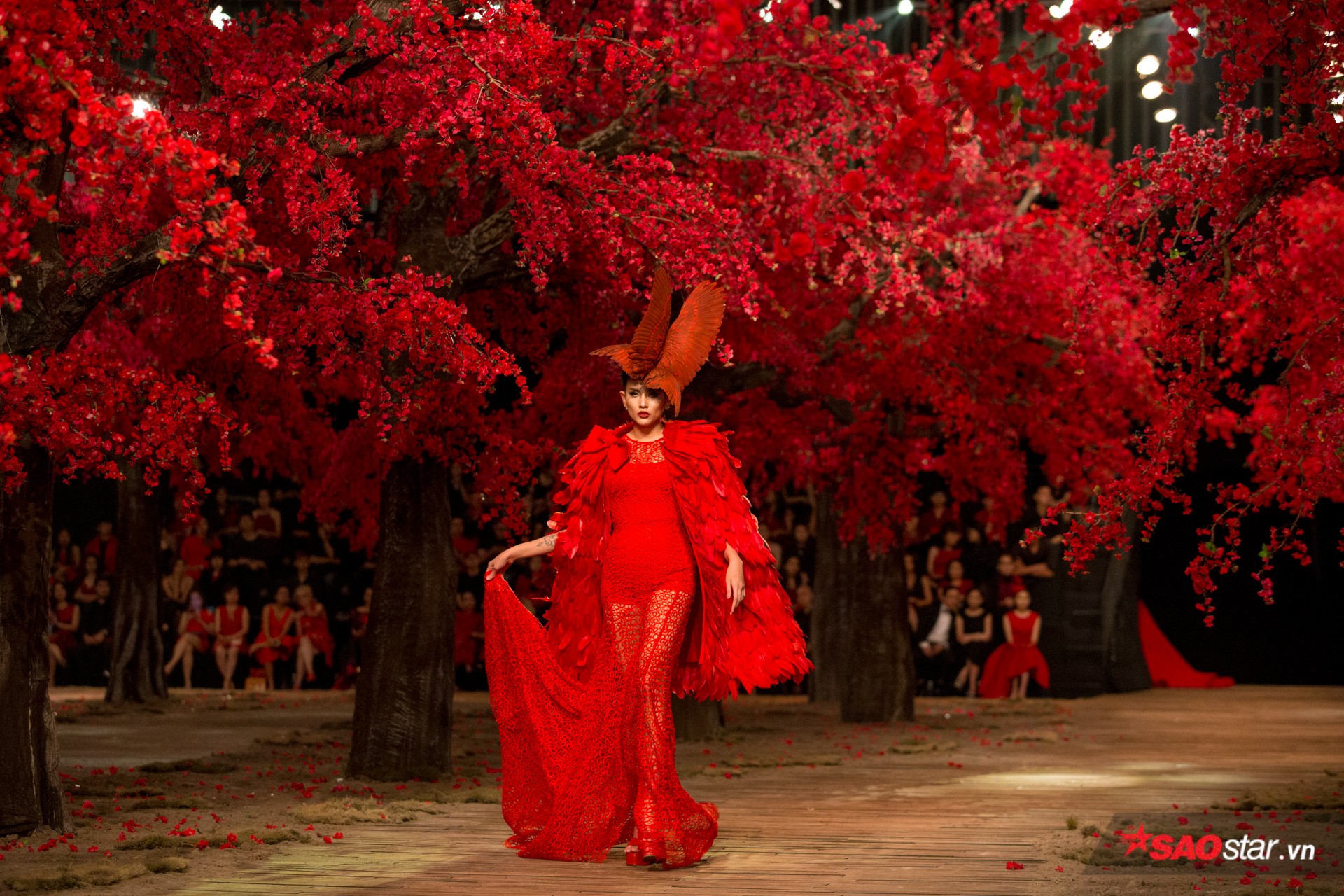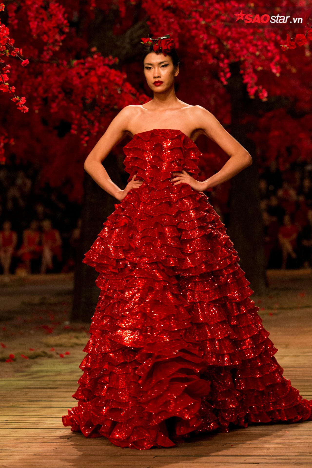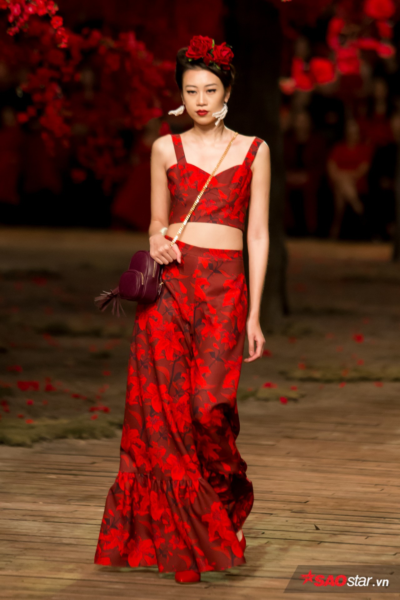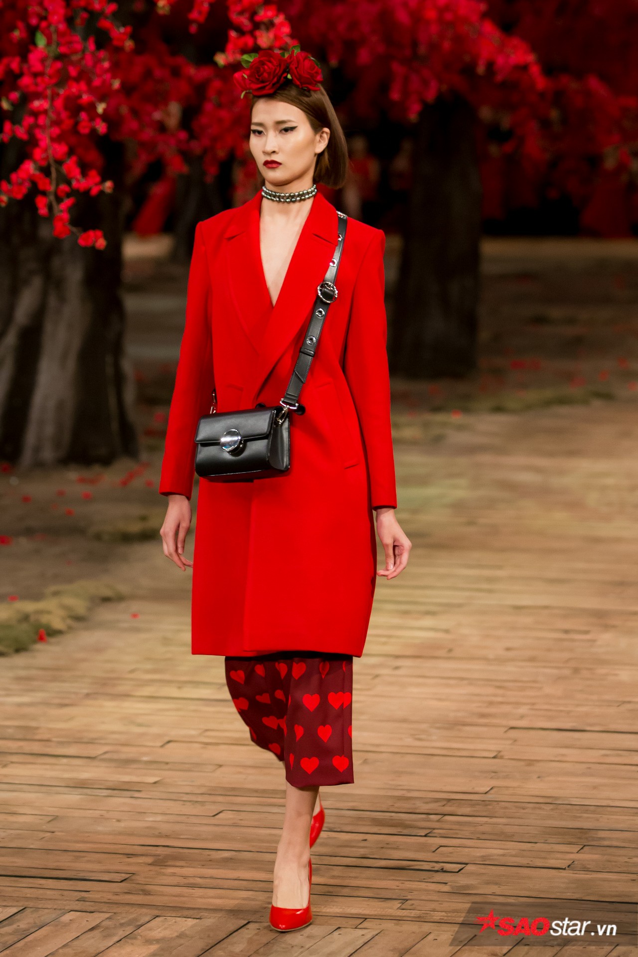 Sử dụng độc nhất gam màu đỏ, nhưng cách lựa chọn tông màu, chất liệu “cao tay” khiến bộ sưu tập không hề gây cảm giác chán ngán, trái lại, tạo được nhịp điệu, mạch dẫn trong từng mẫu thiết kế.
