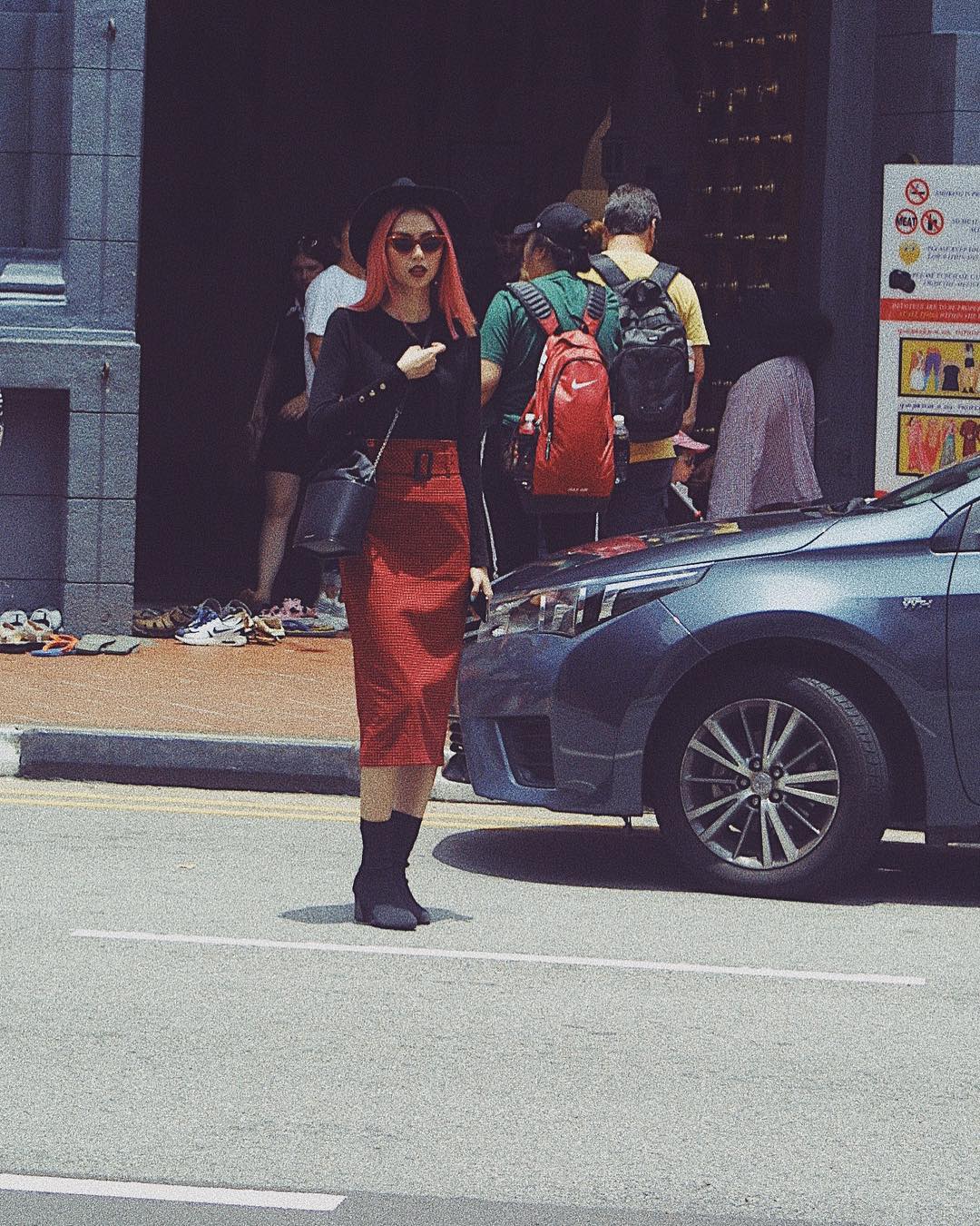 Chân váy đỏ, mái tóc cũng màu đỏ, còn ai nổi bật trên phố hơn người mẫu Thùy Dương.
