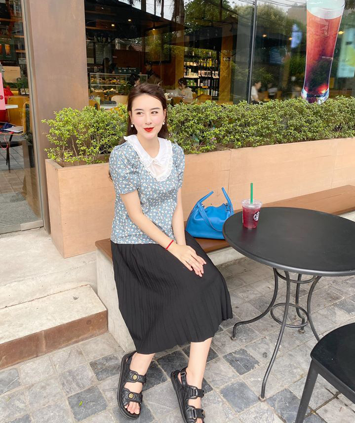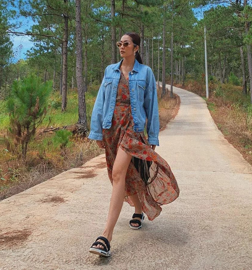 Thay vì chọn phối cao gót hay giày búp bê nữ tính, với chiếc áo hoa nhẹ nhàng này, Hà Lade chọn mang cùng sandal phom dáng to, mạnh mẽ.
