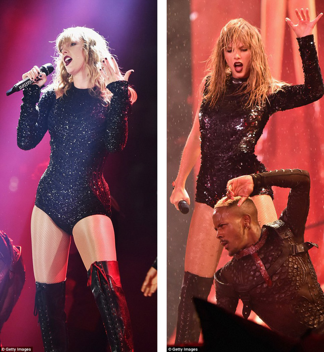 Ca sĩ 28 tuổi đã chọn một leotard sexy ngay sau đó.Trang phục này in họa tiết da rắn và được bao phủ bởi một lớp vải đen xuyên thấu gợi cảm. Đây là sự kết hợp 2 trong 1 cực kì tuyệt vời mang lại 1 hình ảnh đầy quyền lực cho Taylor.