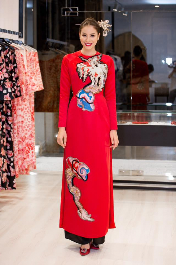 Đối với các tín đồ muốn nổi bật thì màu sắc áo dài như đỏ, vàng, xanh cũng trở thành tips vô cùng hay ho từ Hoa hậu Phạm Hương.