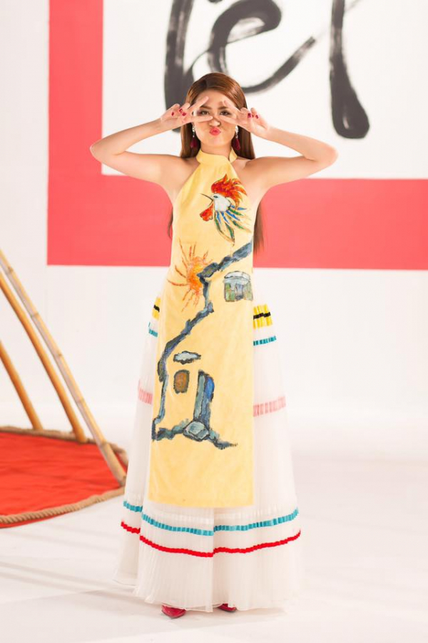 Hoàng Thùy Linh trẻ trung, gợi cảm với tà áo dài được cách tân bằng hình ảnh chiếc áo yếm cùng cách kết hợp chân váy xếp pli kẻ sọc màu sắc nổi bật.