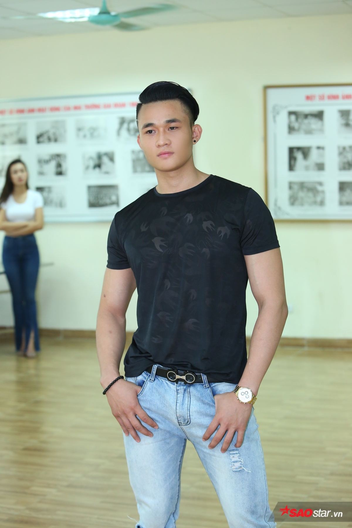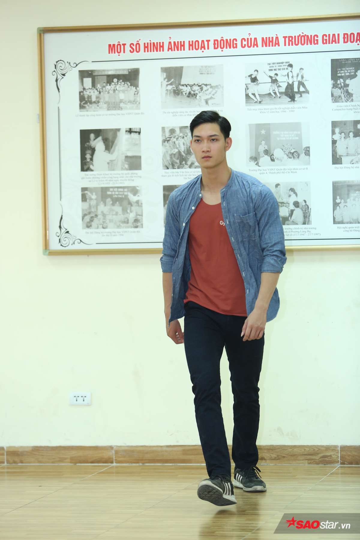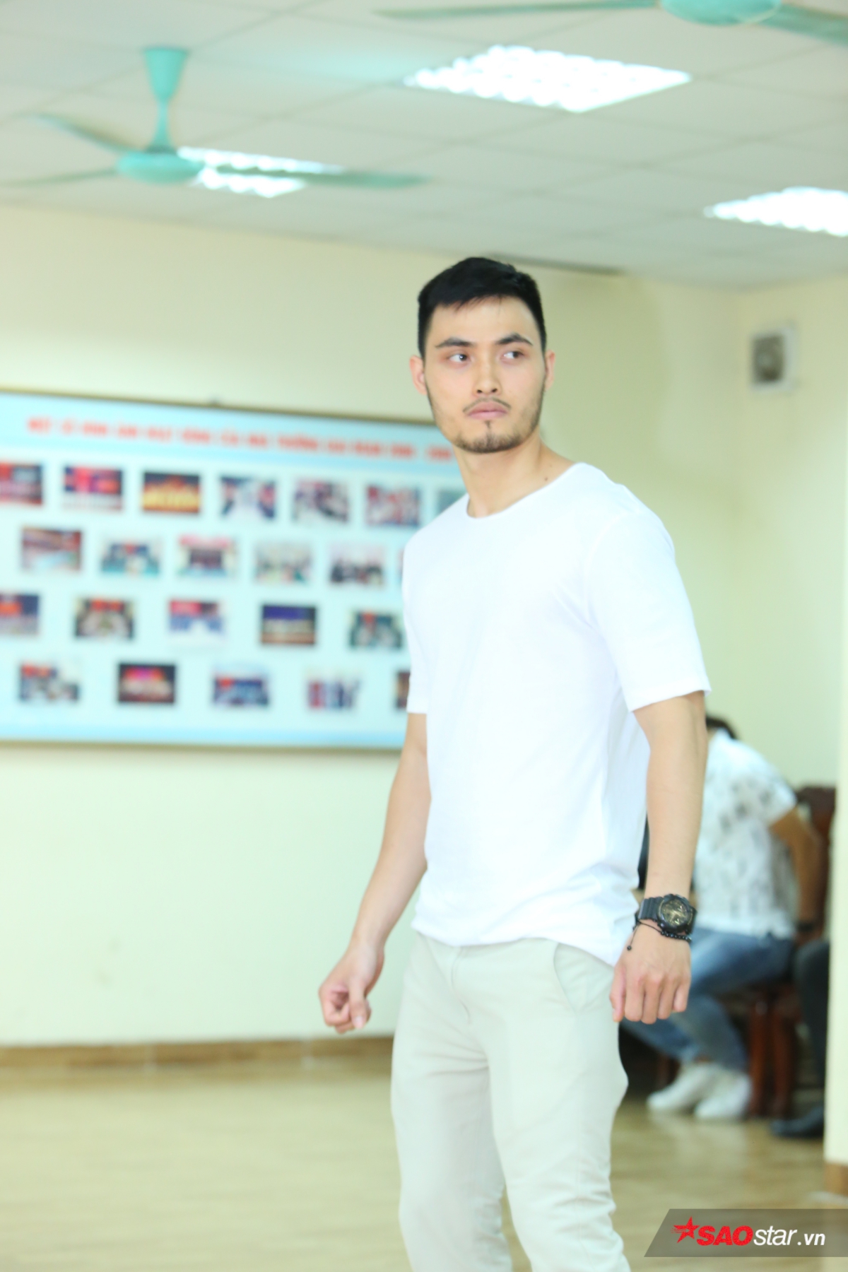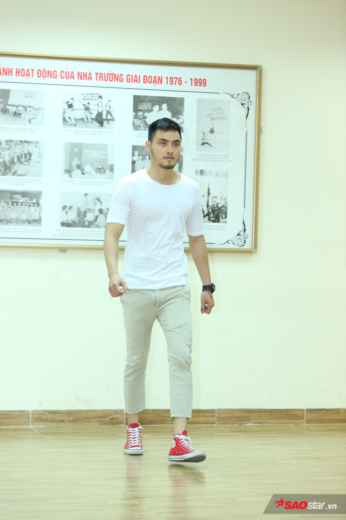 Chưa có kinh nghiệm catwalk nên chàng trai sinh năm 1991 tỏ ra khá nghiêm túc trong buổi training.