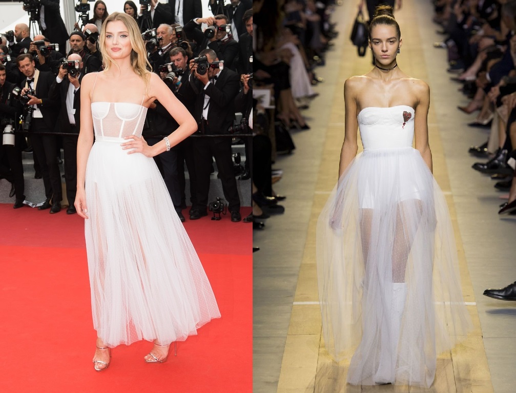 Siêu mẫu nước Anh Lily Donaldson “hạ cánh” thảm đỏ trong mẫu đầm chít eo xuyên thấu trắng tinh khôi - một thiết kế trong bộ sưu tập Xuân Hè 2017 của Dior.