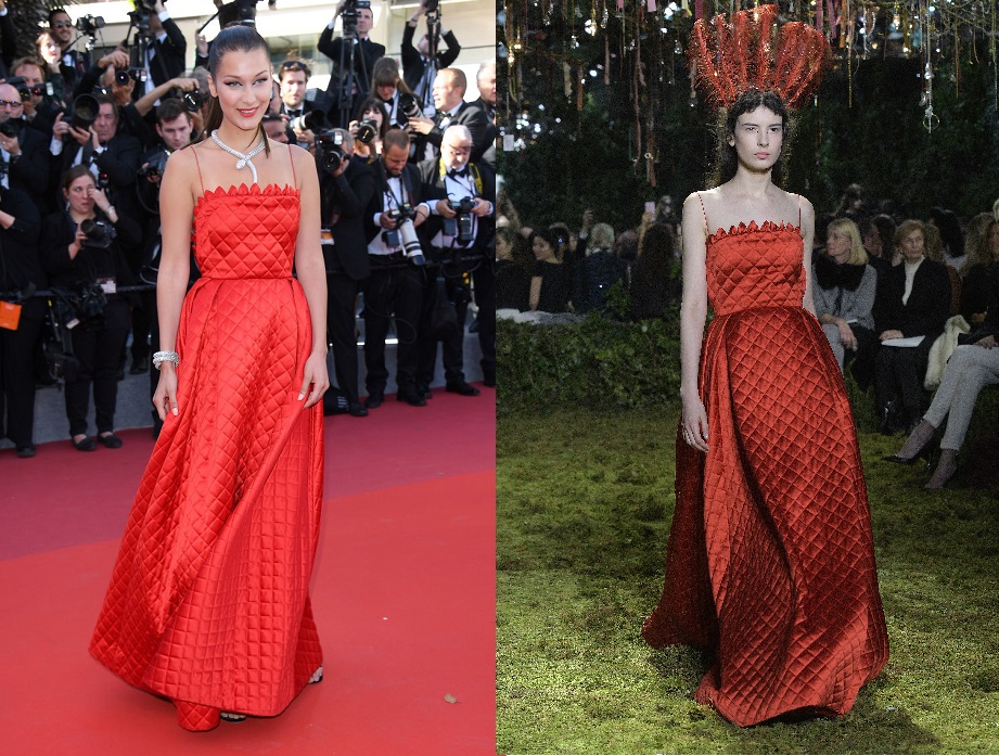 Người mẫu Bella Hadid “thắp sáng” cả vùng trời Cannes với bộ váy Couture Xuân Hè 2017 của nhà mốt Dior. Thiết kế độc đáo với chất liệu vải đệm giúp người đẹp lọt top ngôi sao có phong cách ấn tượng nhất trong sự kiện.