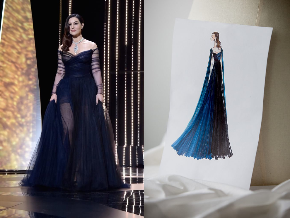 Trong khi người xem đang mơ màng với những bộ váy tinh khôi, thanh thoát thì nữ minh tinh Monica Belluci lại dẫn dắt mọi ánh nhìn với chiếc đầm xanh navy - màu sắc làm nên Dior năm 2017. Đây là thiết kế dành riêng cho Belluci, được may thủ công trên nhiều lớp vải voan mỏng.