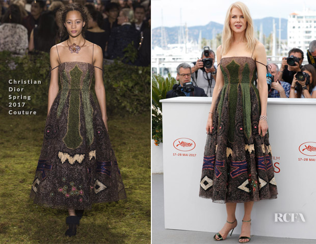 Nữ diễn viên Nicole Kidman nền nã trong thiết kế Couture Xuân Hè 2017. So với sự hoang dã người mẫu thể hiện trên sàn diễn, nữ diễn viên nhẹ nhàng và thanh lịch khi mix đầm cùng đôi sandals xanh hài hòa với màu váy.