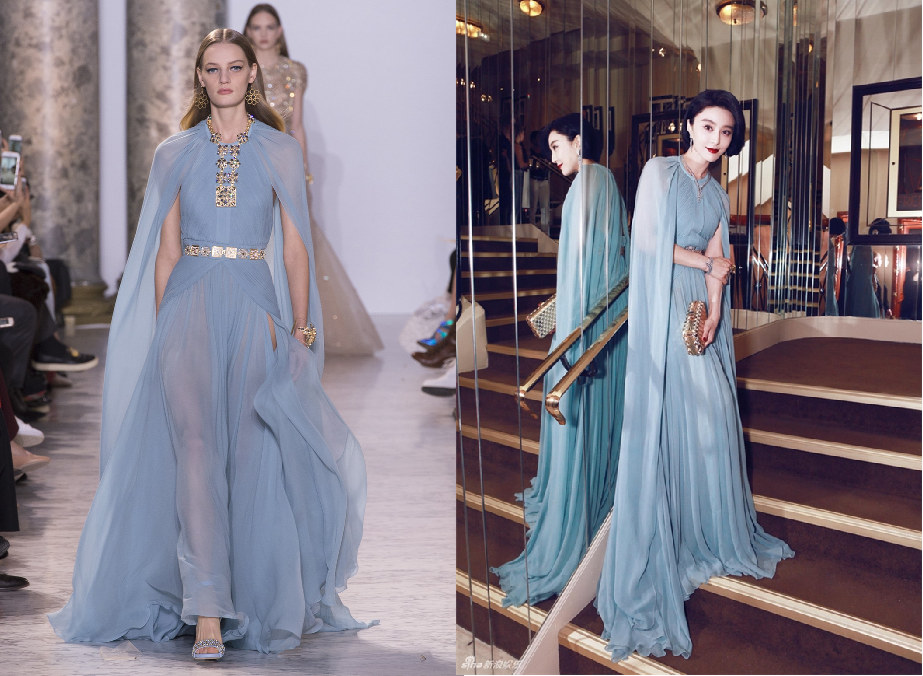 Chiếc đầm xanh pastel nằm trong bộ sưu tập Xuân Hè 2017. Phạm Băng Băng vẫn đẹp đẳng cấp khi diện những bộ cánh nhà Elie Saab.