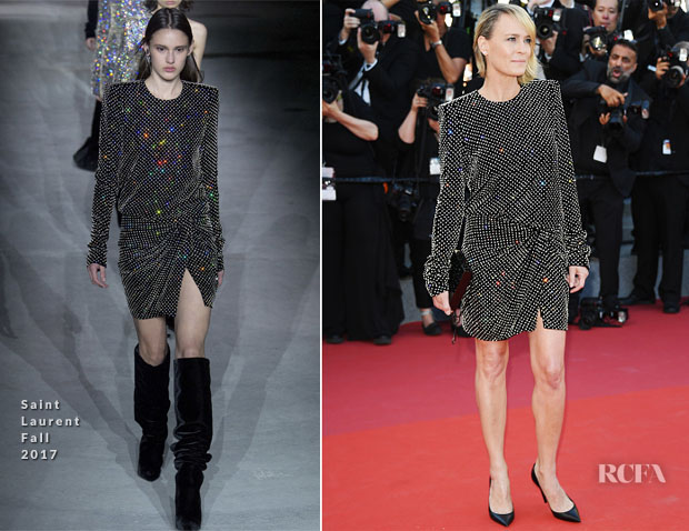 Robin Wright lựa chọn chiếc đầm đính kết lấp lánh độn vai đầy mạnh mẽ trong bộ sưu tập Thu Đông 2017, tuy nhiên thiết kế này lại không tôn lên được đường nét xinh đẹp trên cơ thể của nữ diễn viên.