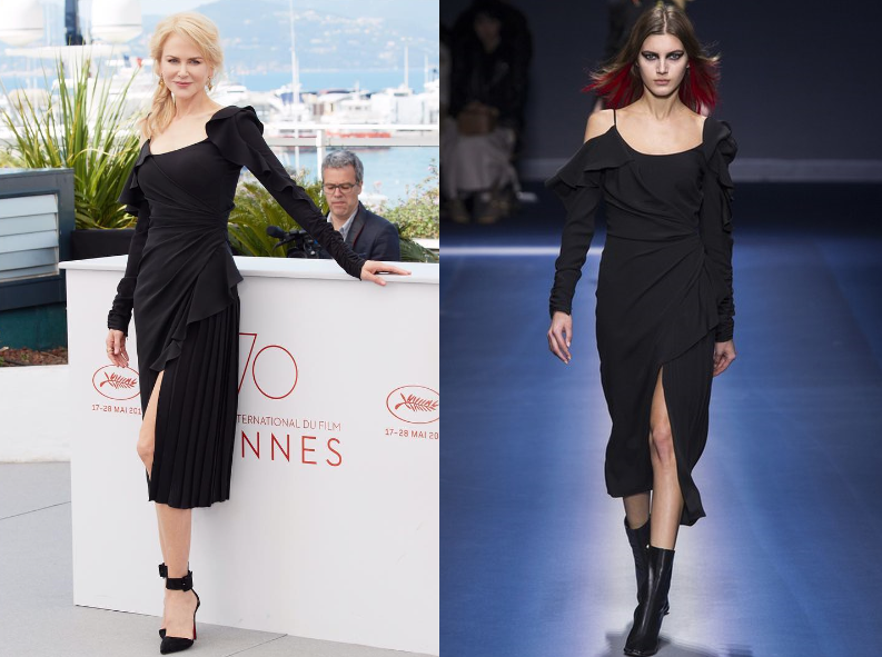 Nicole Kidman chọn tông đen với váy bèo nhún cut-out trong bộ sưu tập Thu Đông của Versace 2017.