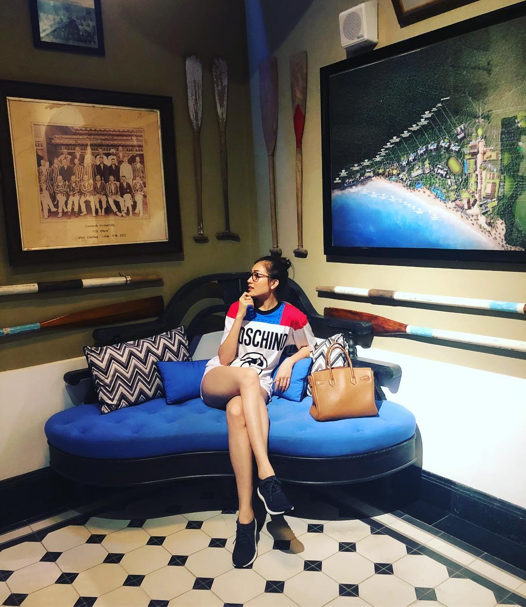 Váy dáng dài màu sắc của Moschino cùng giày thể thao đơn giản là lựa chọn của á hậu Lệ Hằng khi xuống phố.