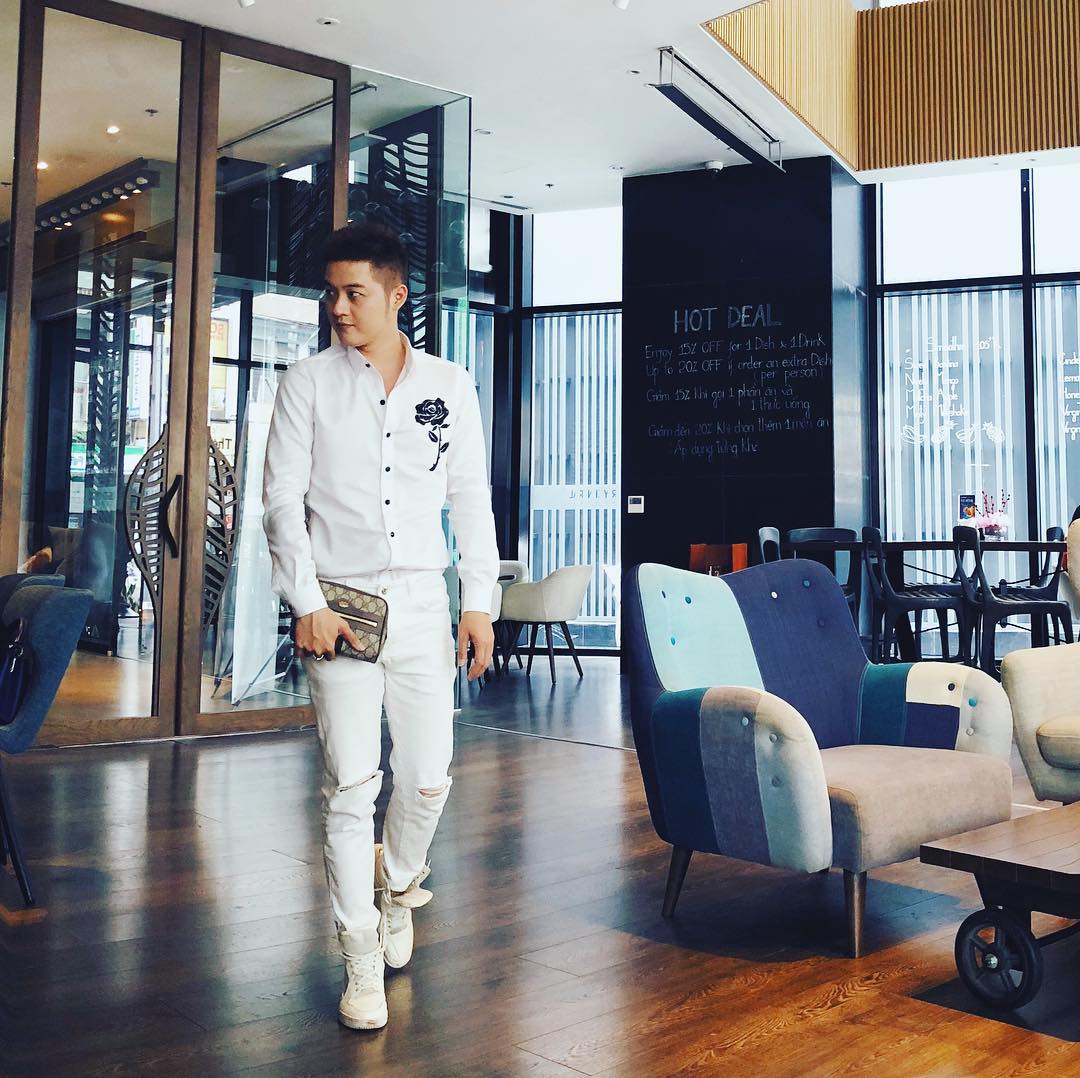Trong cả “cây trắng” thanh lịch thế này, Thanh Duy chọn cầm tay chứ không đeo hông nữa.